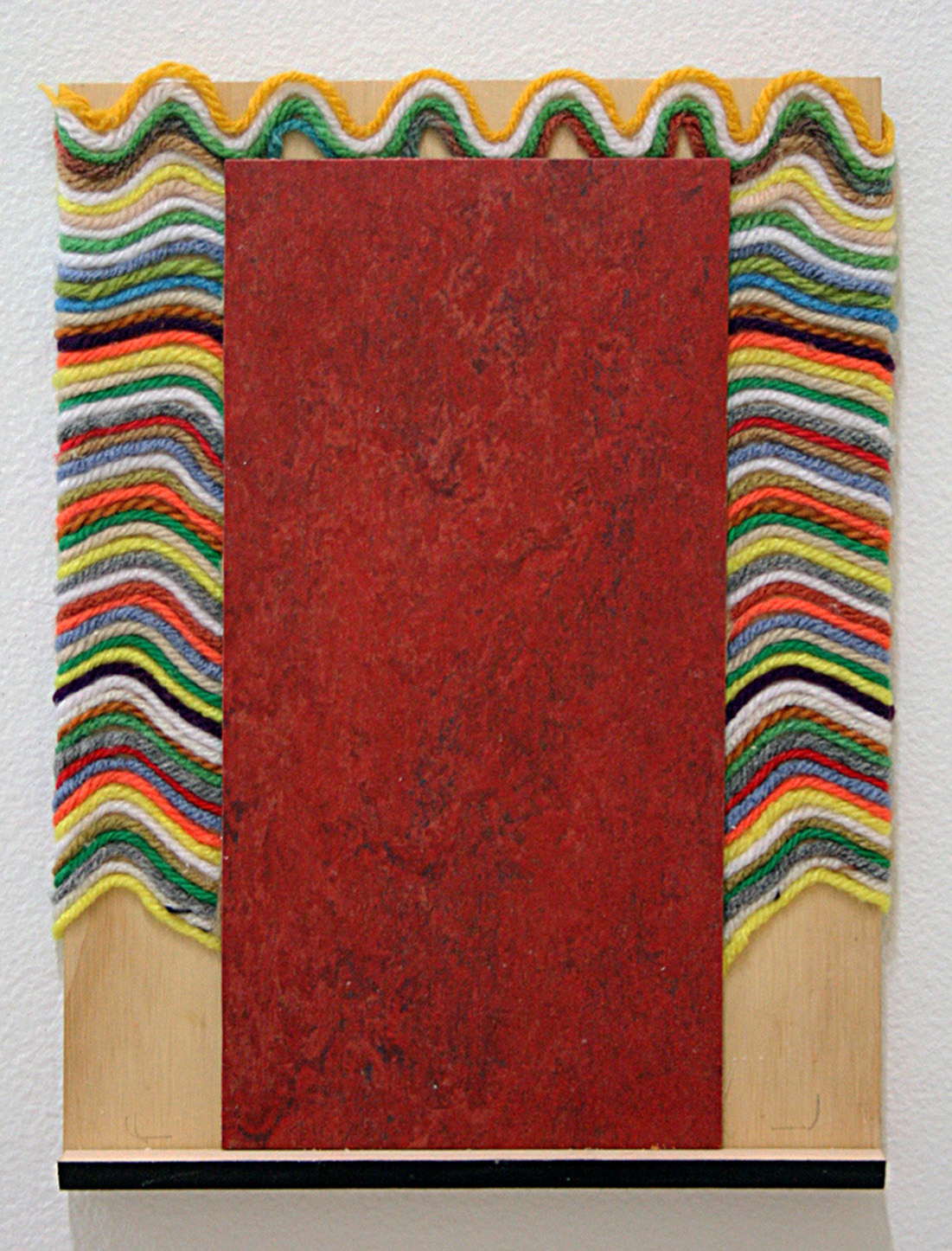 Alex Ebstein is another artist using yarn for abstract, compositional purposes; she draws and paints with the material, often layering it into concentric, textural layers and waves. In three smallish mixed media works that read like paintings, Ebstein creates bold and curious contrasts between bright and dull colors, slick and matte surfaces, as well as areas of implied texture with actual. Ebstein’s tight, symmetrical compositions reference framing elements or letters of the alphabet, and she uses “auto-striped” and “self-patterning” yarns to create additional levels of volume, variety, and pattern.