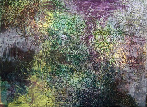 “Engulfed: Works on Paper by Allison Long Hardy” is an enigmatic exhibit currently in the Rice Gallery at McDaniel College that concludes the 2011 year with a reflective body of art that breaks down a fundamental and personal aspect of daily life: communication. Long Hardy takes these moments of contact and translates them as marks on colorful monotypes. The sensitivity that she has to the various layers of interactions between people is apparent in the layer after layer added to her monotypes, occasionally with the further addition of collage and pencil drawing atop already developed works.