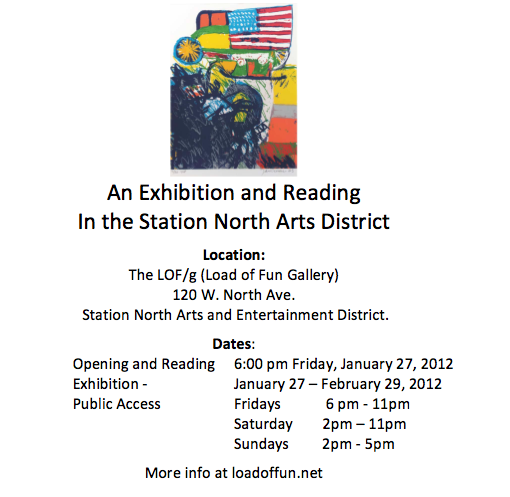 This exhibition is the first public exposure of these works in the USA. The exhibition opening and reading will take place in the newly renovated Load of Fun Gallery (LOF/g) 120 West North Avenue at 6:00 pm, Friday, January 27th, 2012 and continues for the month of February, 2012.