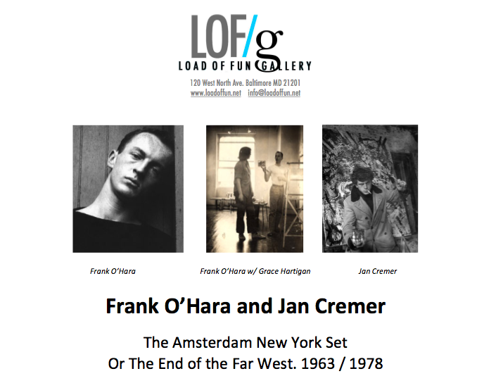 Load of Fun Gallery (LOF/g) presents a silkscreen print exhibition and poetry reading of the works of Baltimore born artist, poet, curator and critic Frank O’Hara (1926 – 1966). The exhibition combines the silkscreen printed poems of Frank O’Hara, silkscreen illustrations by his associate Jan Cremer, and spoken readings of poems and texts by Frank O’Hara. The silkscreen prints were printed by Sherwin Mark and Zeger Reyers for The Printshop and Jan Cremer in Amsterdam, Netherlands in 1978.