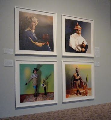 Some of the most extreme and theatrical images greet you at the beginning of the exhibit, as part of the Global Dandy section. Each of Nigerian photographer Iké Udé’s grid of four, large color images features an elegantly draped model in a studio, wearing a combination of African cloth, British hounds tooth couture, and all manner of elaborate hats, including turbans and caftans decorated with flowers. Daniele Tamagni’s images are no less dramatic, despite being shot in populated urban streets of Brazzaville, a city in the Republic of Congo. In Willy Covari, Brazzaville, 2008, the subject strides down a busy street, chomping on a cigar, practically glowing off the page in a hot pink suit, red tie, red bowler hat, and a pale pink shirt. Contrasting mightily with the earth-toned background, Willy Covari is confident, masculine, and stands out aggressively from his environment. In Nintsikelelo “Lolo” Veleko’s images from South Africa, the models wear bold colors, multiple patterns, skirts over pants, and heavy makeup. Of all the images in the exhibit, Lolo’s most obviously pair feminine and masculine fashion (some of his models appear to be women); her photographs approach the project from a perspective which challenges ideas about gender within the dandy phenomena.