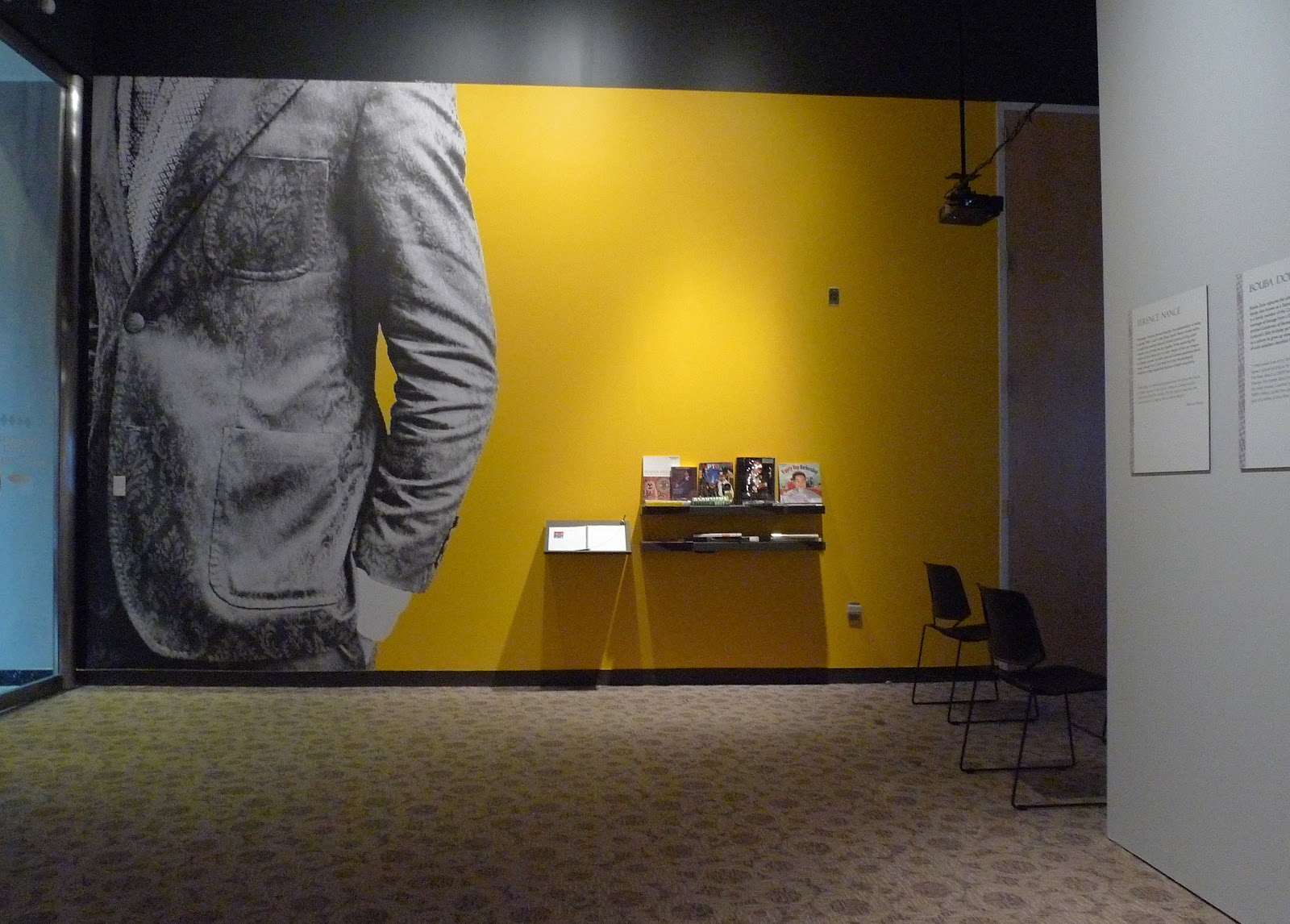 Filmmaker Terence Nance contributes two short digital films to the exhibit. In Black Beau, he employs an existential standpoint to explore “what a dandy is and is not.” Framed as an archaic educational film, Nance shot the footage on an 8 mm camera to reinforce the aesthetic. The film layers bold statements in all-caps text (“A DANDY KNOWS A WELL CUT FONT”) with simple, animated patterns and footage of good-looking, well-dressed black men. Overall the pieces come off as humorous, lyrical, with an nostalgic, early MTV feel and flow.