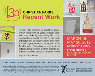 Christian Parks transcends the banality of simple, familiar objects such as easels, notebook paper and cinder blocks by manipulating their forms, experimenting with color and altering their scale and proportions. By visually isolating these forms from their original context and placing them within the white walls of the gallery, his brightly colored and playful sculptures and paintings transform the mundane and evoke a sense of humor and wonder.