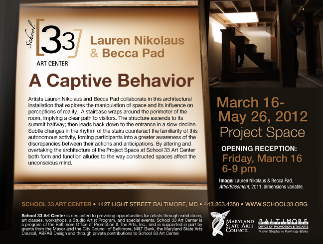 Artists Lauren Nikolaus and Becca Pad collaborate in this architectural installation that explores the manipulation of space and its influence on perceptions of reality. A staircase wraps around the perimeter of the room, implying a clear path to visitors. The structure ascends to its summit halfway; then leads back down to the entrance in a slow decline. Subtle changes in the rhythm of the stairs counteract the familiarity of this autonomous activity, forcing participants into a greater awareness of the discrepancies between their actions and anticipations. By altering and overtaking the architecture of the Project Space at School 33 Art Center both form and function alludes to the way constructed spaces affect the unconscious mind.
