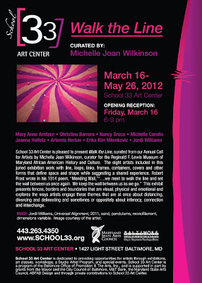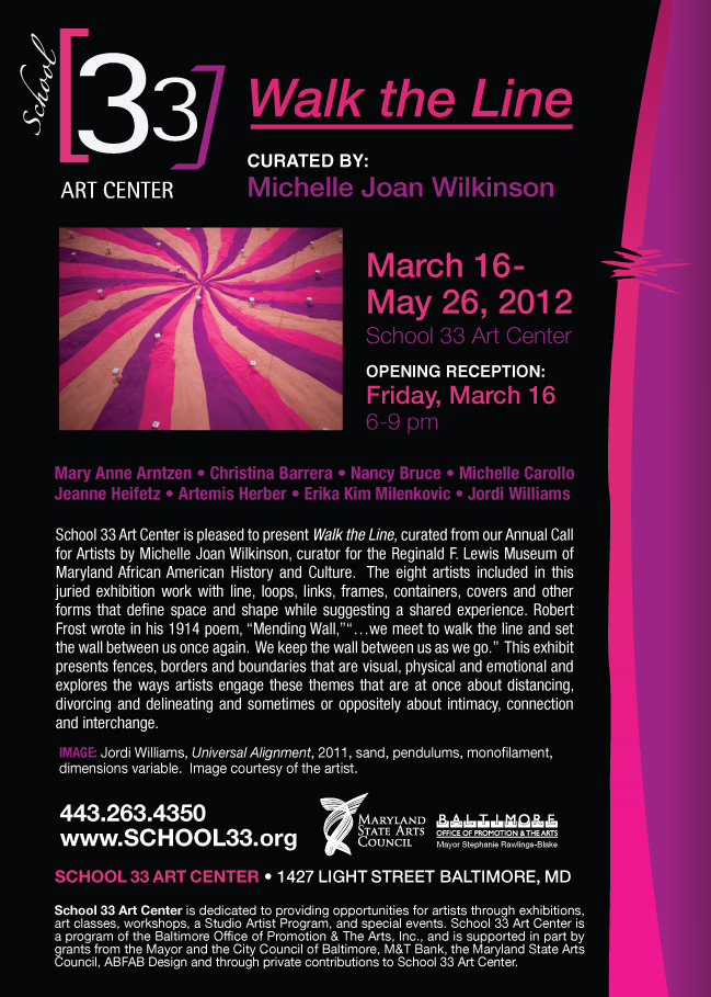 School 33 Art Center is pleased to present Walk the Line, curated from our Annual Call for Artists by Michelle Joan Wilkinson, curator for the Reginald F. Lewis Museum of Maryland African American History and Culture. The eight artists included in this juried exhibition work with line, loops, links, frames, containers, covers and other forms that define space and shape while suggesting a shared experience. Robert Frost wrote in his 1914 poem, “Mending Wall,” ”…we meet to walk the line and set the wall between us once again. We keep the wall between us as we go.” This exhibit presents fences, borders and boundaries that are visual, physical and emotional and explores the ways artists engage these themes that are at once about distancing, divorcing and delineating and sometimes or oppositely about intimacy, connection and interchange.