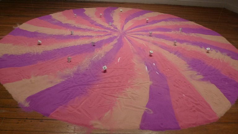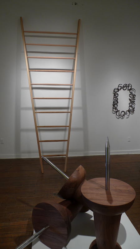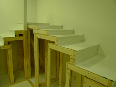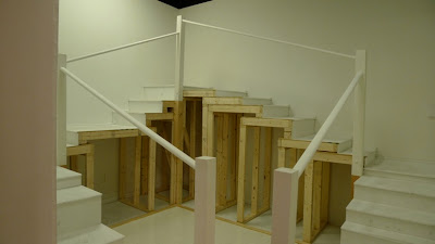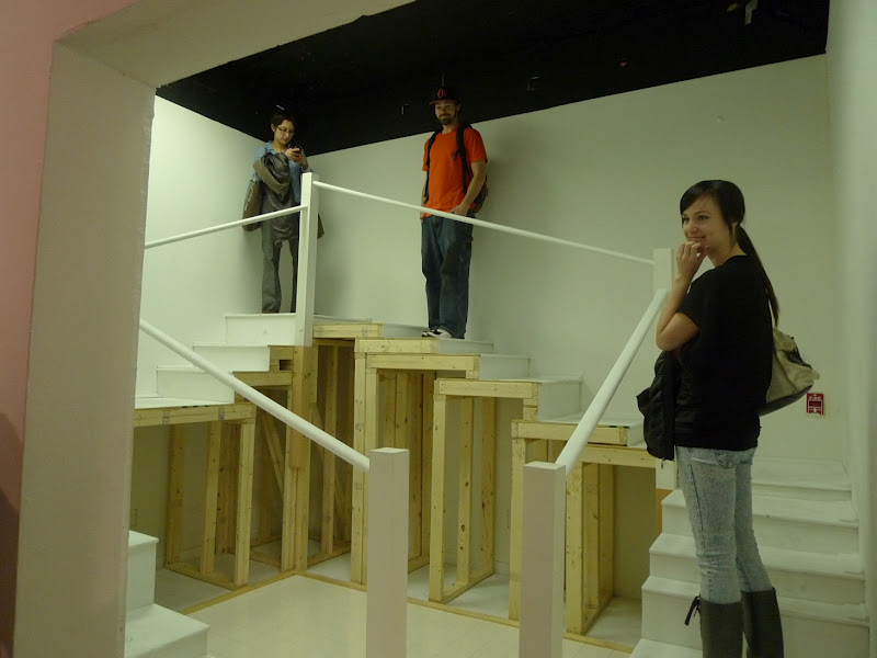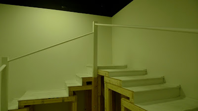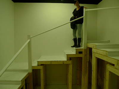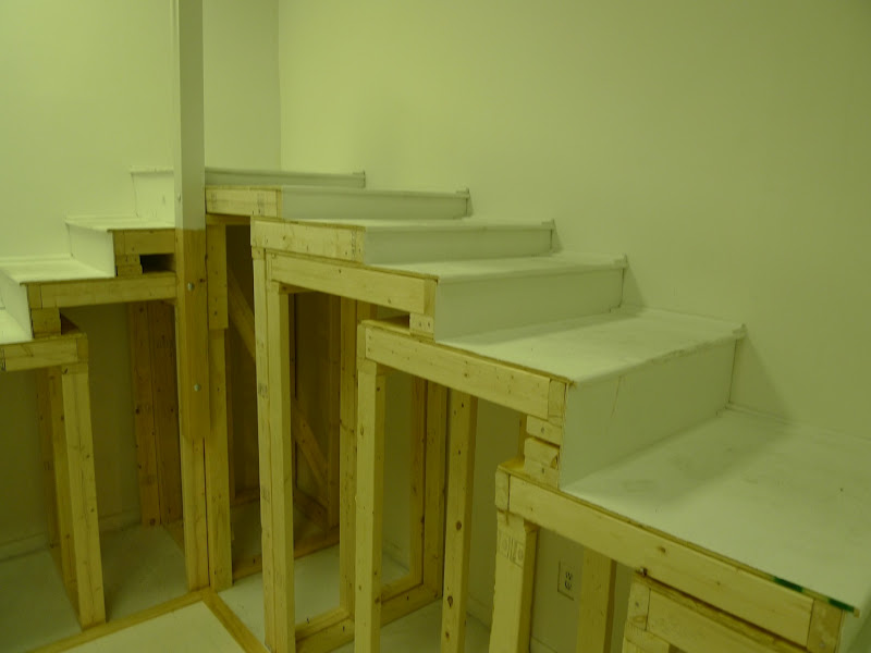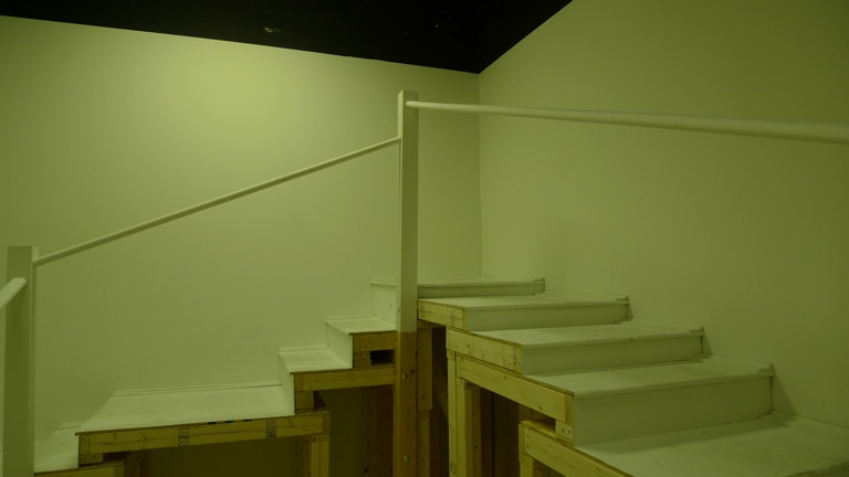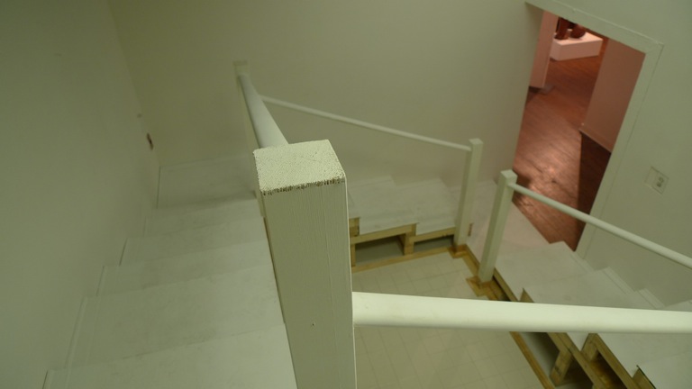 Artists Lauren Nikolaus and Becca Pad collaborate in this architectural installation that explores the manipulation of space and its influence on perceptions of reality. A staircase wraps around the perimeter of the room, implying a clear path to visitors. The structure ascends to its summit halfway; then leads back down to the entrance in a slow decline. Subtle changes in the rhythm of the stairs counteract the familiarity of this autonomous activity, forcing participants into a greater awareness of the discrepancies between their actions and anticipations. By altering and overtaking the architecture of the Project Space at School 33 Art Center both form and function alludes to the way constructed spaces affect the unconscious mind.