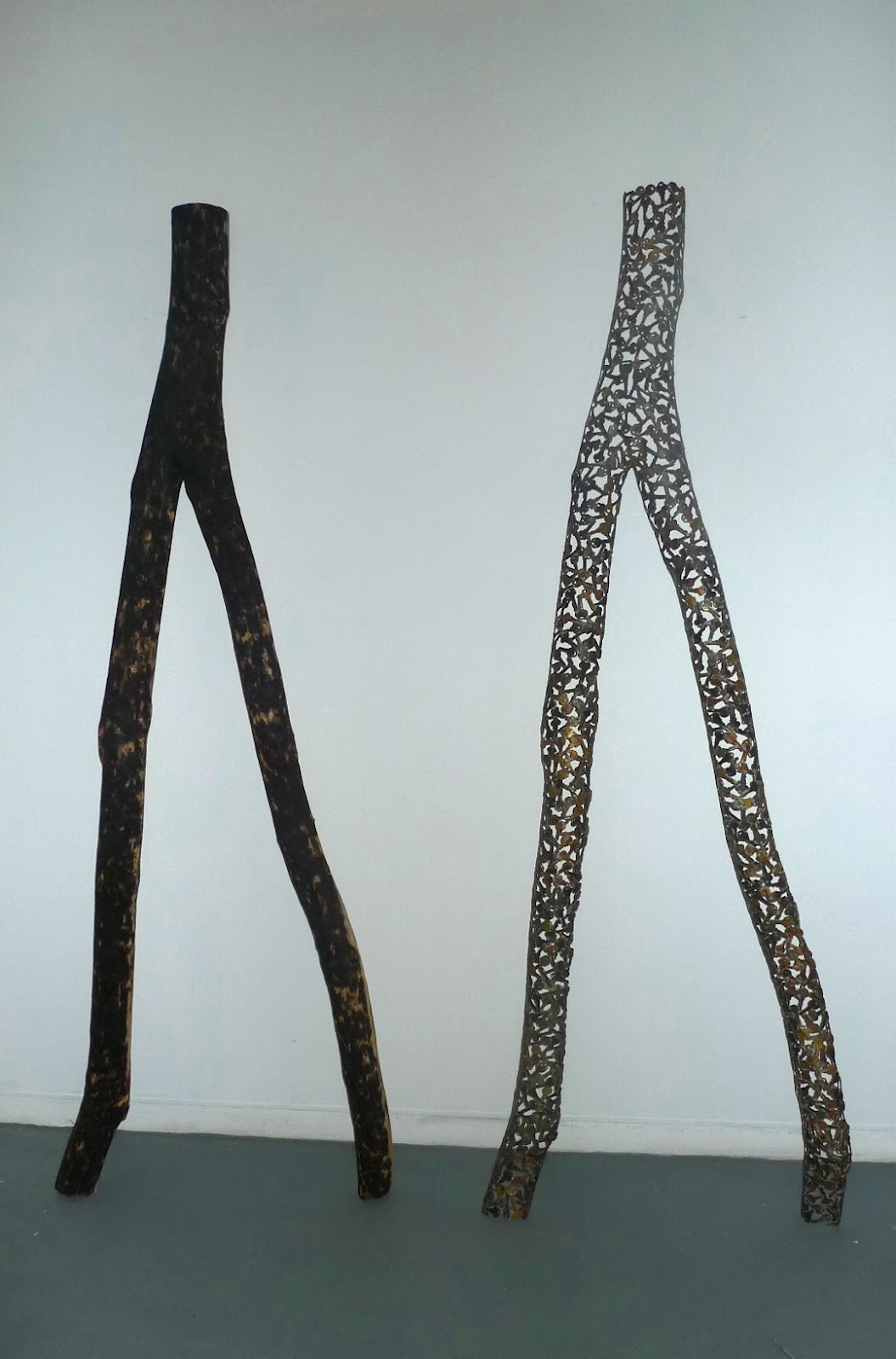 Another standout piece is “The Shroud,” a sculpture by Brent Crothers. From a distance, it looks like two giant wishbones. One shape is actually a natural piece of wood, trimmed to be about 6 feet tall and vaguely symmetrical. An identical partner shape stands next to it but is a honeycomb of negative space, as light and airy as a web. The structure is actually made from hundreds of brass keys, welded together in one thin layer. The two shapes posses a haunting sensation and a primal energy together, although the brass version might be more impressive if it stood alone, without an obvious clue to its creation.