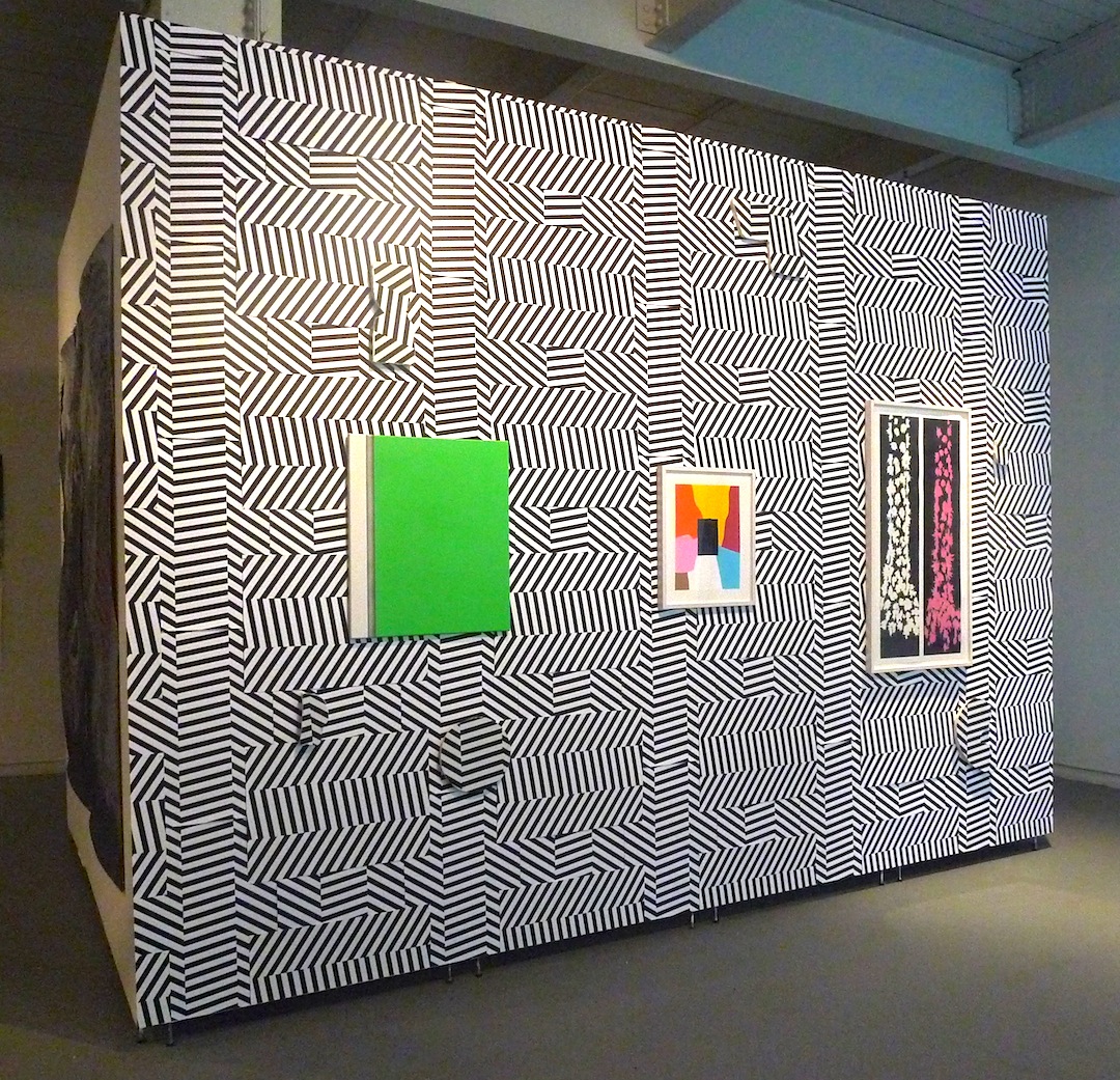 John Bohl’s “Untitled,” around the corner from Crothers’ piece, demands your attention from a distance. The black and white striped wall of hand screen-printed wallpaper creates a fun optical illusion: Like a herd of zebras, it tickles your eyes when you gaze at it from different directions. On top of the wallpaper, Bohl has hung three individual, framed works which might not be as interesting were they not mounted on the busy background. However, this may be part of the fun. Bohl’s wallpaper and images are confidently simple and employ playful color and pattern. His carefree attitude is infectious, and the wall is a show-stopper.