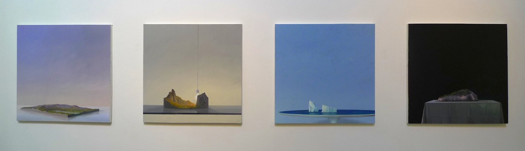 Around the corner, Matthew McConville’s newest paintings, displayed in a series of four, push the medium of paint into an entity that is solidly pictorial but full of air and atmosphere. Uniquely delicate, McConville merges landscape and still life into peculiar dioramas, where realistic topography is placed on shiny table tops and lit with a naked light bulb. His skill as a landscape painter is highly polished, but the artificial placement of the miniature mountains, glaciers, and hillsides transforms them into contemporary, political statements on complex environmental issues with a precarious balance. In short, they are stunning.