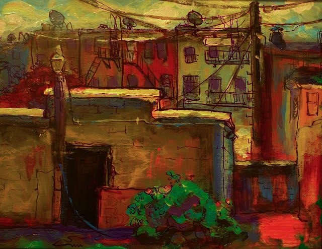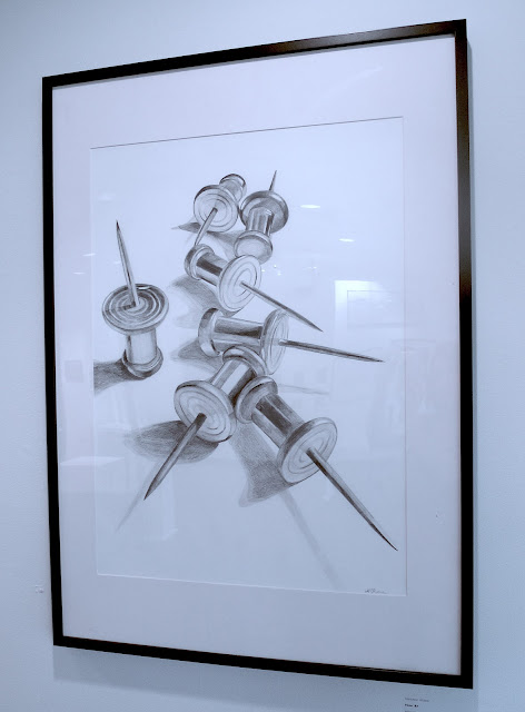 When entering the space, one large drawing across the room catches the eye. A realistically rendered still life, “Pins #3” by Corinna Stone, transforms a banal subject—metal push pins—into monument, where shiny metal and confrontational points become threatening and imposing. In an opposite shift on scale, Megan Amoss’ tiny acrylic and ink landscape painting, titled “Eutaw Place,” transforms the giant, sagging mansions of the location into an colorful, intimate impression. The majority of work in this show is realistic and figurative, and there’s something here for everyone, but, aside from these two pieces, I found many of the abstract works presented to be the most compelling.