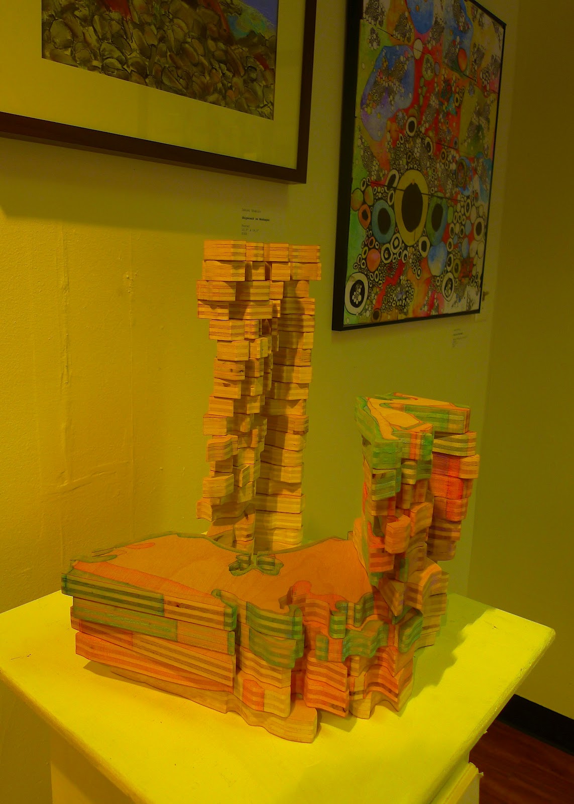 Displayed in the window, “Snack Machine Wooden” by Leo T. Hussey is an oddball mix of faux wood grain, linear cartoon, and comic doodle. It’s displayed as a three-dimensional object, with the drawing stretched over a not-quite-symmetrical shape; it’s unclear whether it’s intended to be satirical or earnest, but it possesses an oddly appealing energy. Howard Greenberg’s “Cards” is a bold, allover design in in black felt-tip pen. It falls somewhere between decorative pattern and OCD doodle, but its wonky line work reminds one of Philip Guston’s later drawings. Sarah Butcher’s “Fish Eyes and Eggs” relies on primary colors and rote repetition, where hundreds of simple, circular forms take on a powerful force as they accumulate in a variety of sizes. The most ambitious works in the show are by Brooke Sturtevant-Sealover, whose “The Notation of the Allocation of Consumption and Progress1C” merges the aesthetics of a topological map with wooden Jenga pieces and piles. Although it’s three-dimensional and displayed on a pedestal, the artist considers the work to be a drawing, with each organic plywood layer incised with fine lines and subtle color shapes. In another drawing, Sturtevant-Sealover displays rolled scrolls of vellum on a table, with her notations fading into layers of the semi-transparent paper.