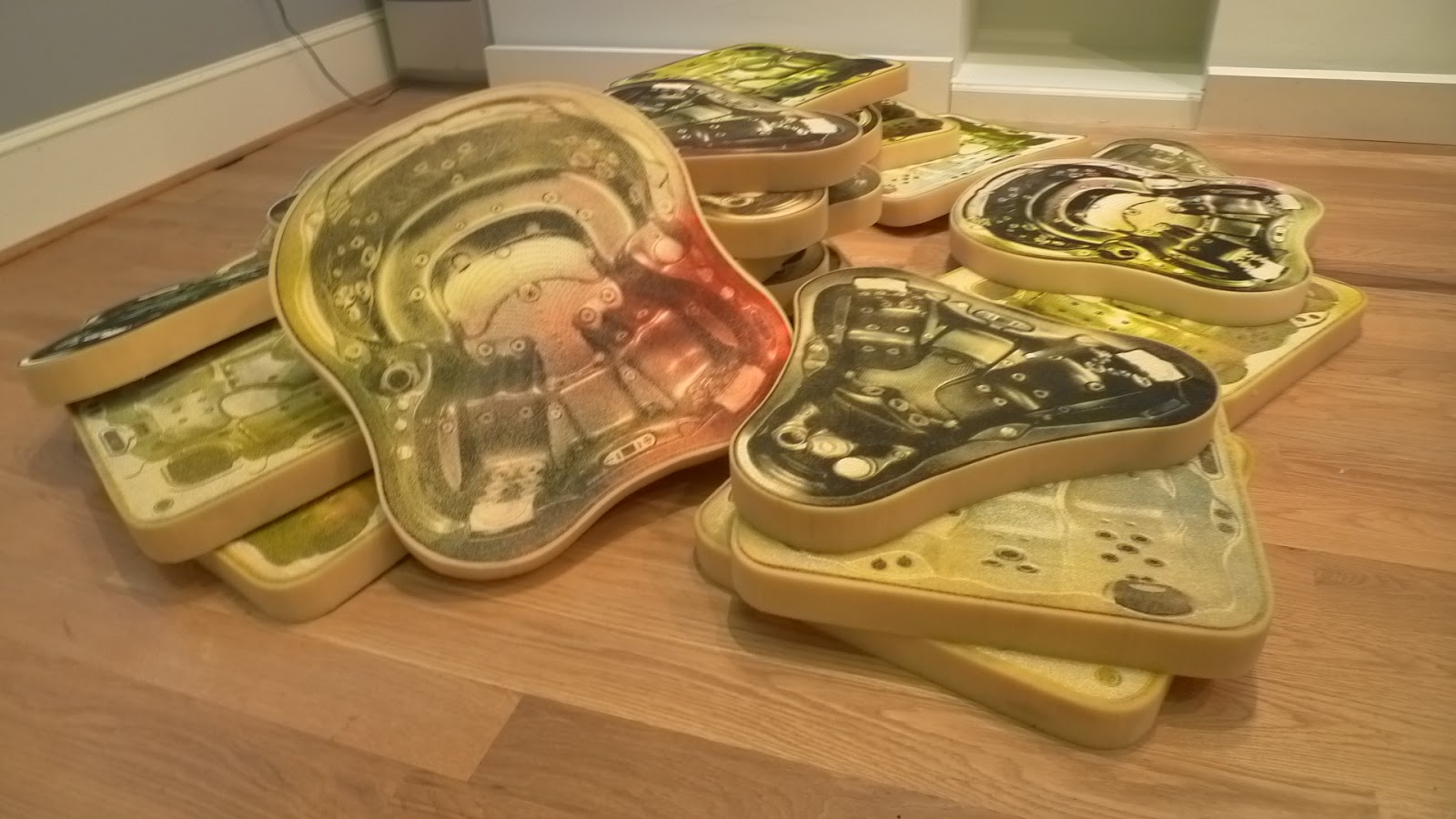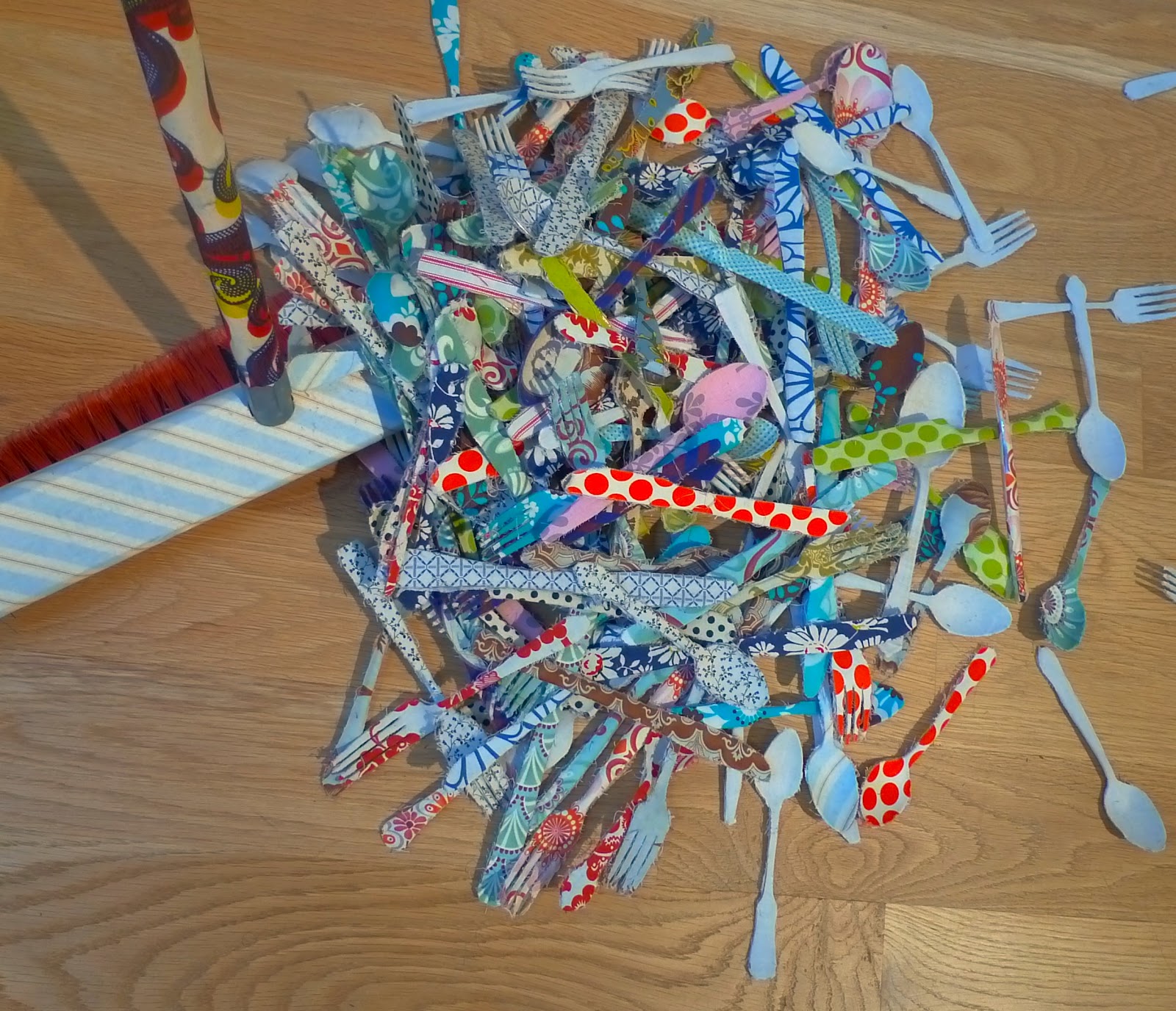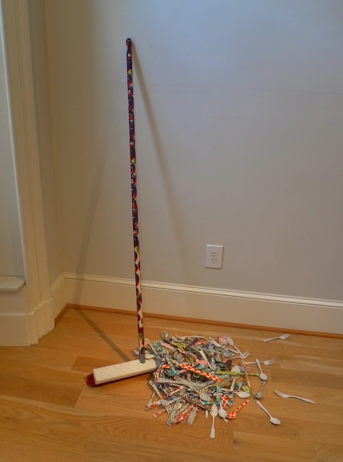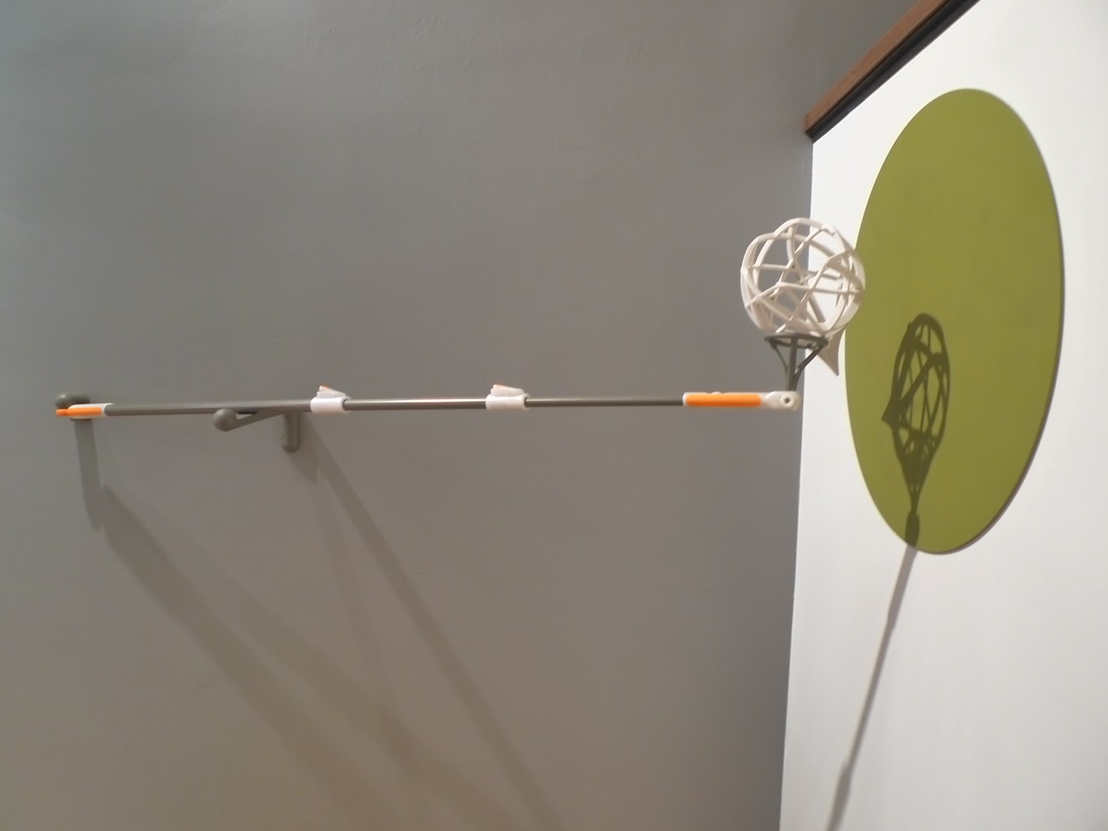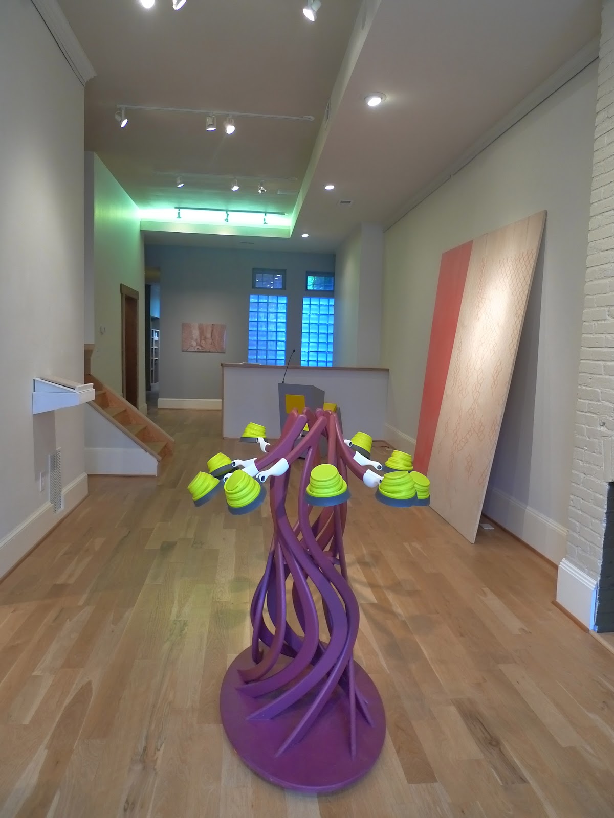 Baltimore-based Ryan Hoover’s sculptures unite mechanical and organic characteristics into hybrid forms, which feel oddly complete, as if they made themselves through spontaneous generation. His largest piece, “Awkward Party 2012,” combines elements of a table, a chandelier, and kitchen utensils into an imposing, radial construction. Its bright purple and green colors, as well as its repeated curving legs and arms, give it a Dr. Seuss-ian association, but its mechanical aspects take it beyond cartoon. The piece includes a photopolymer 3D print, which accounts for its seamless construction, one that seems untouched by human hands.
