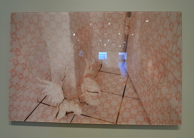 Kim Faler’s paintings and sculpture take center stage in the exhibit, with a giant, hot pink painting called “Untitled (fence).” Constructed of two wood panels that lean on the ground, the piece glows like a Rothko from a distance, but up close there is a delicate, incised line drawing of a wonky chain link fence. I don’t know about you, but I’ve seen way too many paintings of chain link fences lately—but this one is arresting, due to its huge scale and bold color, which contrast mightily with the delicate lines. Another strong piece by Faler is “Current,” a 4-foot-high pile of stacked issues of the New England Journal of Medicine from 2005 to 2012. The magazines look relatively untouched—you can read the text on their spines—except that the top section appears to be dyed white and the rest dyed purple. The piece resembles a cairn or some other type of memorial stack and has an unexpectedly totemic, even nostalgic, presence. It makes me wish I hadn’t purged all my Bon Appetit’s from the kitchen cupboard.