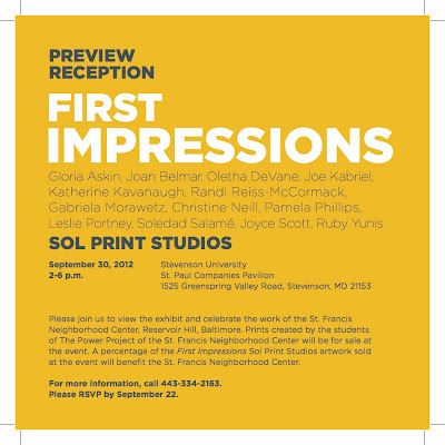 Please join us to view the exhibit and celebrate the work of the St. Francis Neighborhood Center, Reservoir Hill, Baltimore. Prints created by the students of The Power Project of the St. Francis Neighborhood Center will be for sale at the event. A percentage of the First Impressions Sol Print Studios artwork sold at the event will benefit the St. Francis Neighborhood Center. For more information, call 443-334-2163. Please RSVP by September 22.