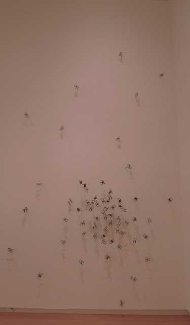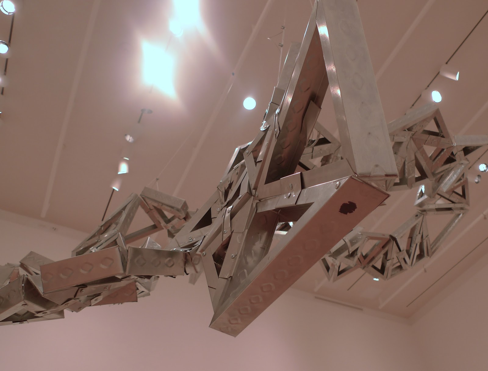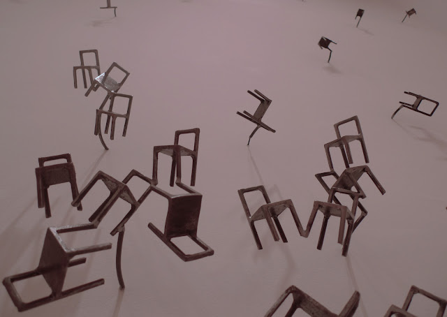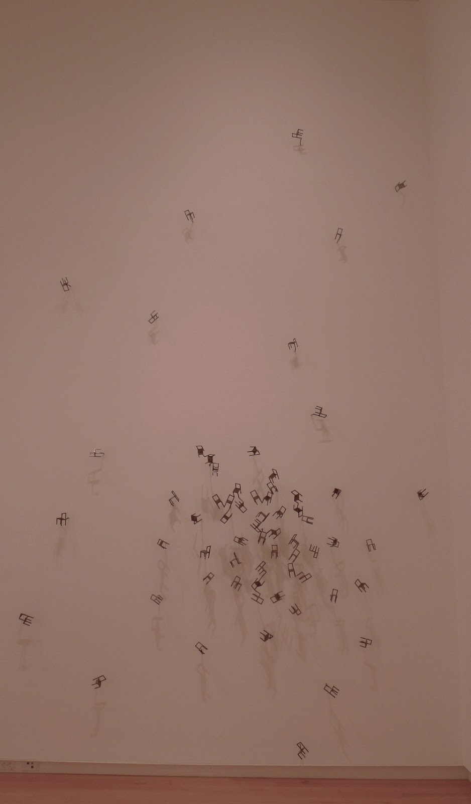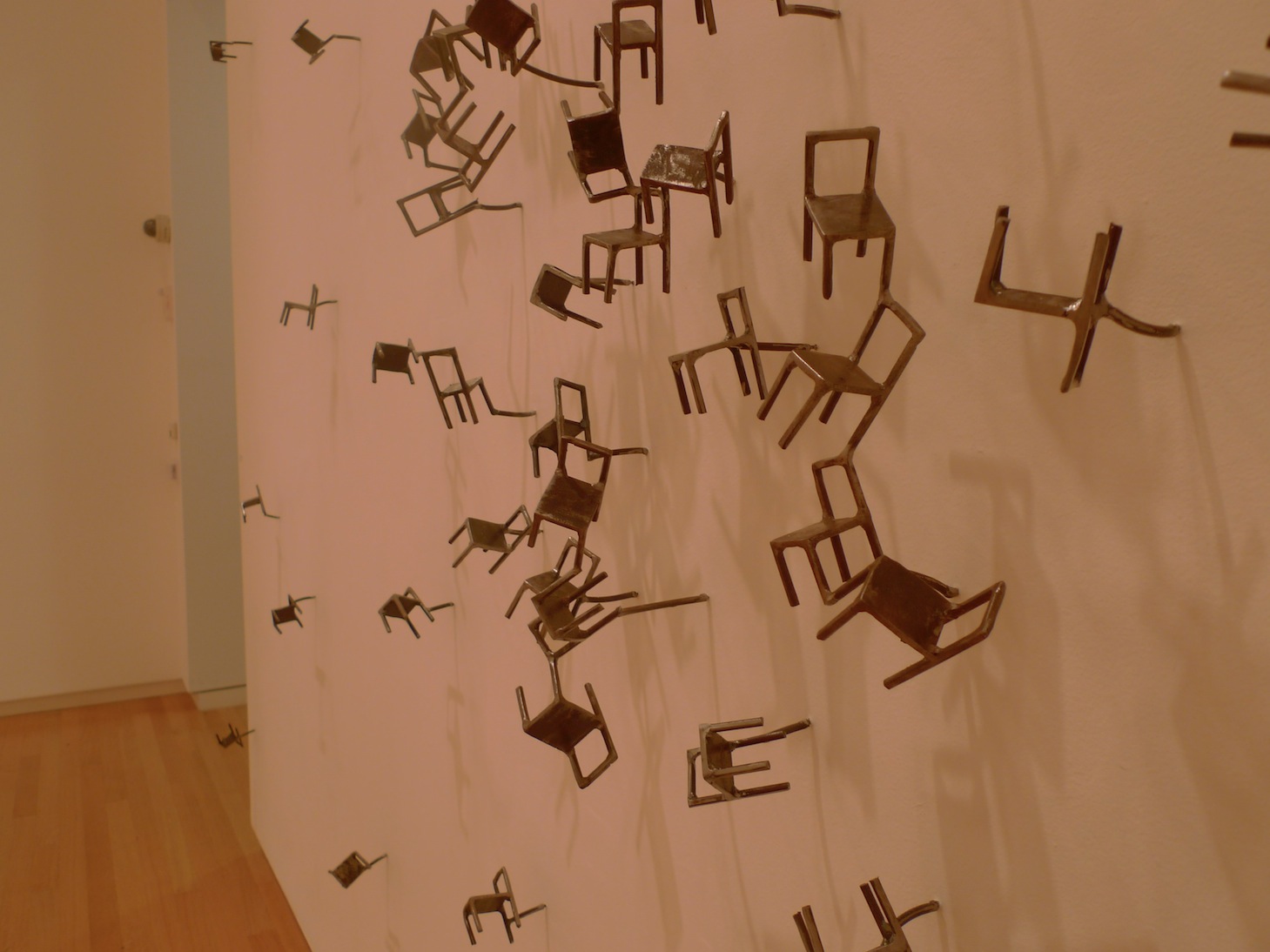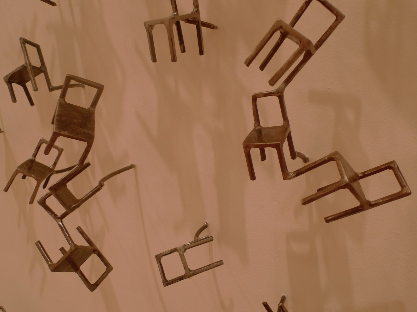 Mary Annella “Mimi” Frank uses the geometry of chairs to explore familial relationships. A chair can be a powerful metaphor, a connection between people and the positions they occupy. Frank’s “constellation” of small welded steel chairs expands across space to illustrate the complexity of interpersonal connections.