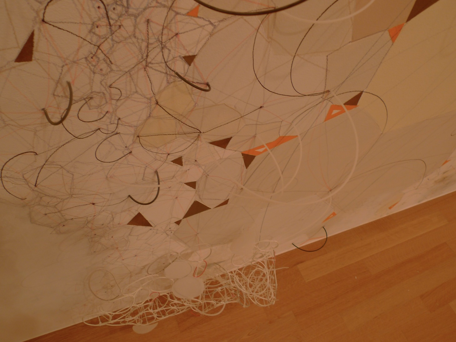 Jowita Wyszomirska’s site-specific wall drawings are dynamic arrays of geometry that navigate between random and chaotic. She employs a range of commonplace materials – masking tape, Tyvek, plastic, and wire – while hovering between two- and three-dimensional states. Intrigued by underlying cycles and ongoing changes in landscape where manmade and natural worlds intersect and override one another, her work reflects the web of complex relations.
