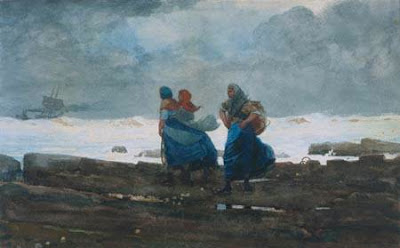 Winslow Homer (American, 1836-1910) Fishwives Homer is great and I think I’ll never every get over him. Here’s one of the watercolors he made while living for several years among the fishing people in a small English seacoast town. These were hardworking people who took enormous risks to go out onto uncertain waters to make a living. To Homer, they seemed heroic, both the men and the women.