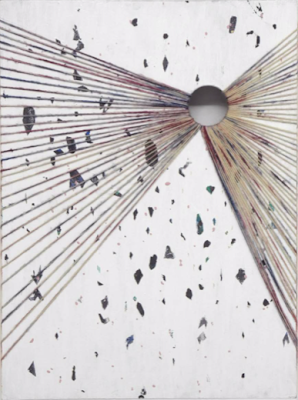 In her own way, Ebstein is creating a codified system of personal signage, where linear pathways converge and hover over a milky color plane. By literally cutting into the surface, the artist strategically plays two and three dimensions against each other, a visual commentary of the meta-visual and shimmering disruptions of perceptions. Ebstein understands this style of perception acutely because she has lived it.