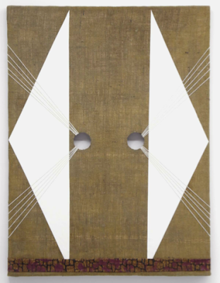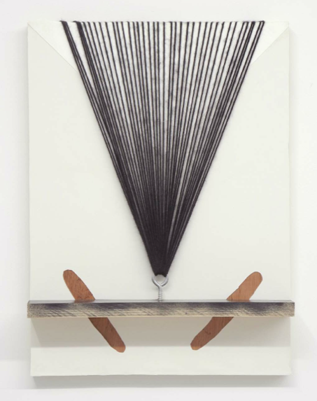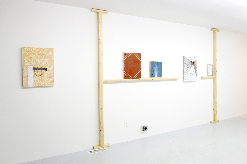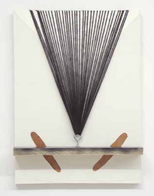 But, viewing the body of work, it becomes obvious that Ebstein sidestepped all potential pitfalls the artist statement had proffered and, instead, offers up an impressive and cohesive collection of paintings that are well executed, and inviting. Using various types of string and twine laid out, glued to, or strung across, above and inside geo color-field surfaces, the work playfully creates illusions that invite the viewer into their maze-like constructions. Her color palette is muted, earthy, and harmonious—rare in these days of high chroma histrionics. Likewise, the construction of the work is firm and infectious, yet is in some ways quite traditional. Moving from painting to painting in this well curated exhibition, one lingers following the interplay of perception, disruption and overlapping ways of seeing— all abstractly rendered.