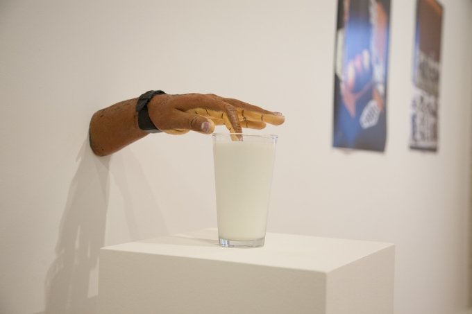 A grilled ceramic hot dog lies on white marshmallow-esque forms, mounted on a found piece of building material. Shingle hangs on the wall, emanating baking urban summers, tar beaches, and stories abound. With an almost crest-like shape to the asphalt, the intention to commemorate is clear. Smirk-worthy sculptures dot the gallery courtesy of Luis Arnías. A peeled back lid of a large, fabricated metal sardine can reveals a bunch of fingers inside. What’s the story? Arnías’playful work welcomes the viewer to imagine their own narrative. A single forearm extends from the wall, dipping a finger in a glass of milk that sits on a podium. The title, A lo Poncio Pilatos, is a Spanish saying which “means that you wash your hands out of the responsibility of the damage done. This piece is based on a personal memory: Guilt, Tease and Origin are the words that echo to me,” Arnías explains. The title provides deeper emotion to an already humorously satisfying piece.