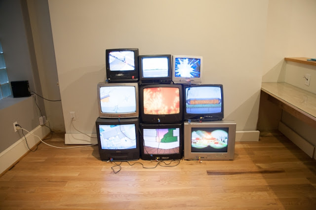 A large cube of nine stacked television monitors silently scream behind the reception desk. Dina Kelberman’s Simpsons Gifs, flash reels of images from the infamous cartoon so etched in many of our childhood memories. Where are the familiar, grating voices, the dead-pan potty humor, the smart-alec son? We see Marge seated at an empty table sobbing dramatically into her hands, Homer suspiciously peeking through horizontal slatted blinds, a harrowing housefire, a rushing river, and an ominous piece of white paper floating down in front of a backyard suburban swing-set. The saccharine colors contrast with the conveyed anxiety in an unnerving visual experience.
