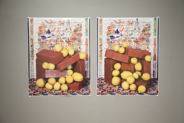 Marina Pinsky’s bright, deliberate still life ink jet prints are saturated with dense layers of texture and narrative history. In one print, the background is wallpapered in antiquated black and white diagrams of milking machines and processing equipment. Over twenty colorful cans of sweetened condensed milk are neatly stacked with labels of pastoral cows, cups of coffee, and rich desserts from India, Russia, Vietnam, and Brazil, among others. Library books form pillars and platforms with titles including Women Dairy Project, This Milk Business, The Milk Question, and Condensed and Evaporated Milk Industry- Productivity Trends 1939-1950 illustrating the history of this internationally common kitchen staple. Pinsky elaborates on the significance, “Sweetened condensed milk is a very energy rich food that keeps forever – it’s the kind of thing that to me signifies prolonged scarcity. But all these countries are now very powerful developing economies. Sweetened condensed milk is a little historical trace of daily life in the machine of world trade.” Her prints give the viewer multiple visual associations to connect beyond the frame.