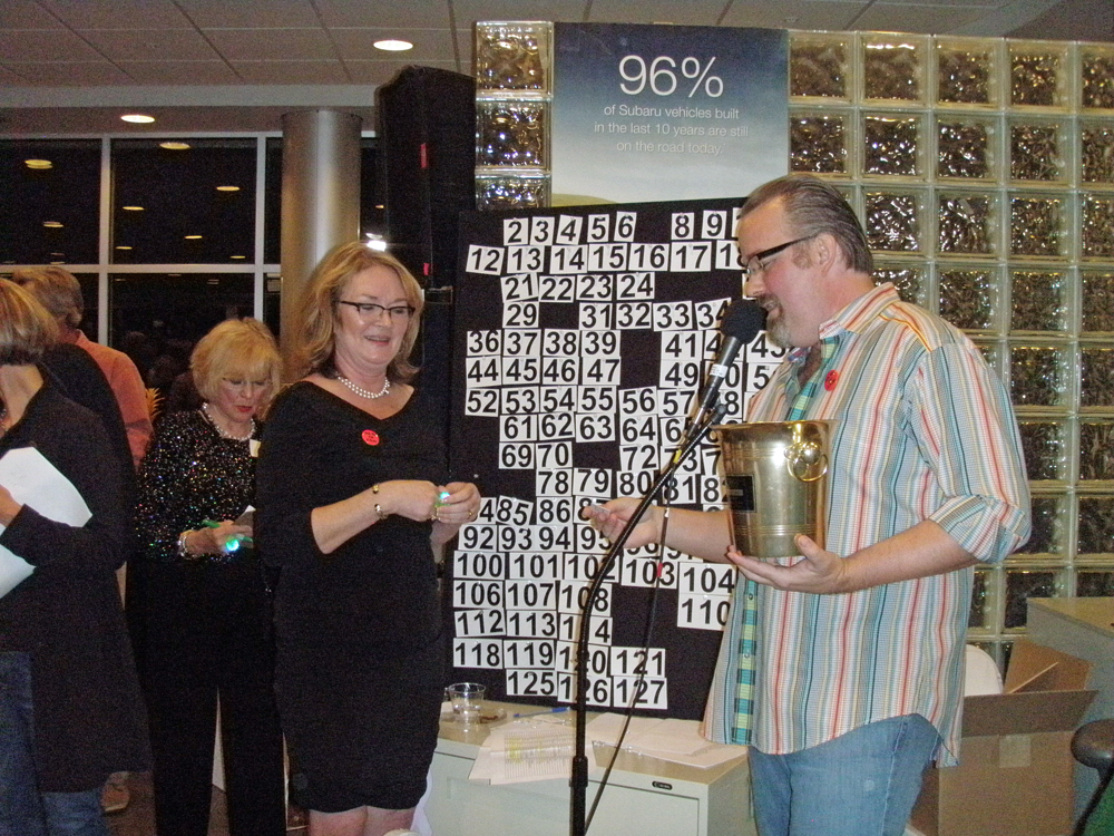 Each work of art is given a number, starting at number one and each ticket is assigned a number starting at three hundred. All the numbers for the artwork are on the actual frame and on a big board at the front of the room. Once the main part of the event begins, moderated by a WNAV radio host, the fun begins. The collectors’ numbers are randomly drawn and they make their selection by saying the number of the artwork and the number is removed from the board and there are groans from other collectors, who may have wanted the same work of art.