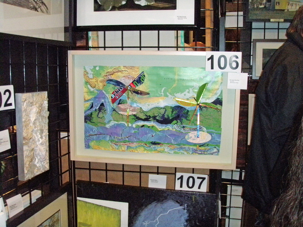 Here is how it works; any MFA member is asked, many months in advance, to donate a work of art, 2-D or 3-D. Some years I made a collage specifically for Collector’s Choice and this year I had something framed that I knew I wanted to donate. Then the collectors/patrons are invited to the event which means they buy a ticket which costs $150 for MFA members and $185 for non-members. The ticket allows 2 people to attend the event including dinner, beer and wine. The food and drink are donated by local restaurants and merchants.
