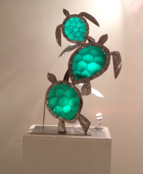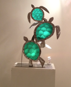 The sculptures of Howard Riopelle, fashioned out of hammered metal, emphasize elegance through minimalism. The first, his “Hare Ball,” is simple with clean edges, using the repetitive shape of a rabbit’s head with long ears. These shapes form two intersecting, unbroken circles, giving the piece a sense of almost mesmerizing unity. His “Celtic Bunny Knot” is similar, using the same element again and again to create a continuous pattern. Riopelle’s final piece, which is a collaboration with Gayla Lee, is a trio of sea turtles titled “Honu (Magical Hawaiian Greenback).” Each turtle is comprised of a hammered metal frame and a sea green glass shell, the three of them linked together in a harmonious curve.