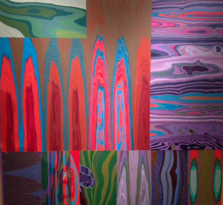 An untitled work by Katherine Tuz-Lau Mann, taking up the entirety of one wall, is another example of carefully ordered chaos. It is made up of twisting shapes which appear indistinct at a distance, yet are actually made up of smaller lines that form an intricate pattern. Ribbons tied in bows, clusters of grapes, and other smaller images make up the larger ones, giving the piece three dimensionality and depth. Its flat black background bespeaks danger, but the effect is lightened by the use of shimmering silver and brighter yellows and blues. Mann’s second piece, “Net,” has an even greater sense of complexity with its multiple layers and mixed elements. She creates cutouts, in a delicate crisscross pattern that is almost like lace, which shows through to a backdrop of magentas and purples. The brightness behind the cutouts contrasts with the black and silver of the main painting, underlining the subtle shapes in the foreground.