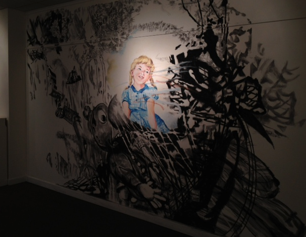The final piece is done by Randi Reiss McCormack, a large mural painted directly onto the wall. It centers around a young girl with two blond braids, wearing an old-fashioned blue dress. She is surrounded by shades of charcoal and gray, creating a stark contrast and immediately drawing the attention to her. The girl is the embodiment of innocence, a vision of light and the security of childhood. The images around her, however, give the painting a distinct feeling of darkness. Shadowy black, they form the shapes of toys—not whimsical but eerie, a leering army encroaching in upon the girl. They swirl around her, threatening to swallow her up, yet she smiles on beatifically in a halo of light, unconcerned and untouched by the chaos by which she is surrounded. Although diverse, the works of these artists are unified by the intense richness of emotion that they evoke. They all accomplish it in different ways, but each piece speaks to the viewer on numerous levels, engaging them and connecting them to what they see. They tower over the visitors, standing taller than they do, yet these super-sized masterpieces inspire them like no others could.