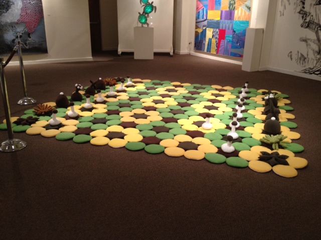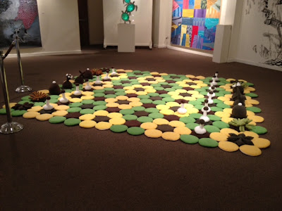Perhaps the piece that commands the most attention is the giant dandelion in one corner—upon stepping inside, visitor’s eyes are immediately drawn to it. It appears to grow right out of the carpet, so natural it seems on its bending stem, its expansive leaves shading the ground. It is fashioned out of fabric, the soft edges blending like the petals of a true flower. The piece was created by Rachel Held, the same artist who made the chessboard. That chessboard, too, is made of fabric, in bright yellows and greens, like those of the dandelion. Rather than using the traditional checkered squares, Held employs a pattern of circles, which as they intersect create flowers. The chess pieces themselves are almost cartoonish, polka dotted toadstools, lily-pad like flowers, and feathery tufts of moss rule the board alongside the ordinarily styled pawns. Both of Held’s pieces feel as wholesome and organic as living plants, as if they sprouted up in a forest meadow.