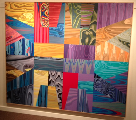 Equally engaging are the pieces by Steven Pearson, two abstract paintings on opposite walls. “Too Good, Too Evil” is particularly captivating, using an electrifying array of color and swirling patterns. While on the surface it appears turbulent, when one looks closer a deeper order is revealed. Every element in the painting is carefully balanced, the pattern on one side a mirror image of the other, and although a large palette of colors is used, they are all subtly repeated throughout. Bold, geometric shapes make up the body of the pattern, but their clean edges unify them and preserve order. Likewise, while the diagonal lines lend the piece a sense of excitement and urgency, stability is maintained by an equal amount of horizontal and vertical lines. Similarly, the second painting, “Some Heroes Step Forward,” is broken into blocks. They are just irregular enough to catch the viewer’s attention, but not so much so that the piece becomes chaotic. The pattern is almost like the grain of wood, which combined with muted colors gives the painting an earthy, serene feeling.