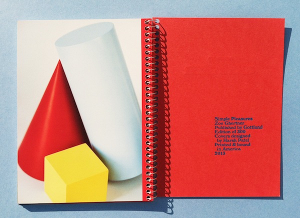 About the book: “Continuing with our ‘year of California books’ the Gottlund book house is pleased to release Simple Pleasures, a new artist book by the Los Angeles based photographer Zoe Ghertner. Between the two bright red card covers, Ghertner has composed a group of measured still lives. The brightly colored painted wooden shapes and their equally colorful backgrounds playfully tease the viewer’s sense of scale, dimension and space.”