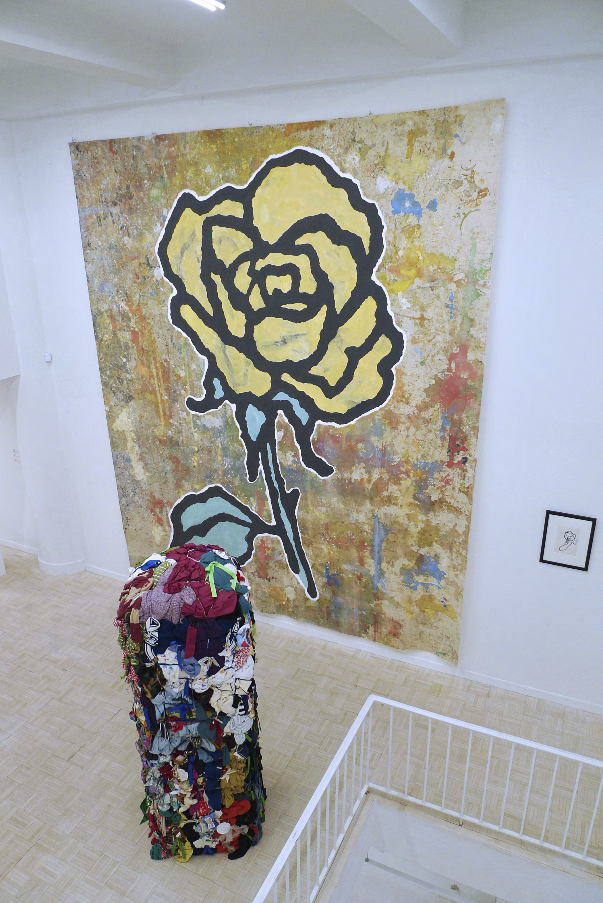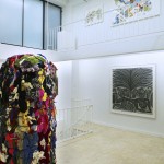 In the second venue – at The KuBe, a former high school converted into an arts center located three minutes away from Dia: Beacon – the presentation features large-scale installations and accommodates many more works. There are three 30-foot sculptures by Frank Hyder – located outside the front entrance, in the former gymnasium, and on the roof. Two site-specific sculptures by Jason Peters wind through a 100-year old beech tree at the main entrance and highlight the rooftop glass greenhouse.