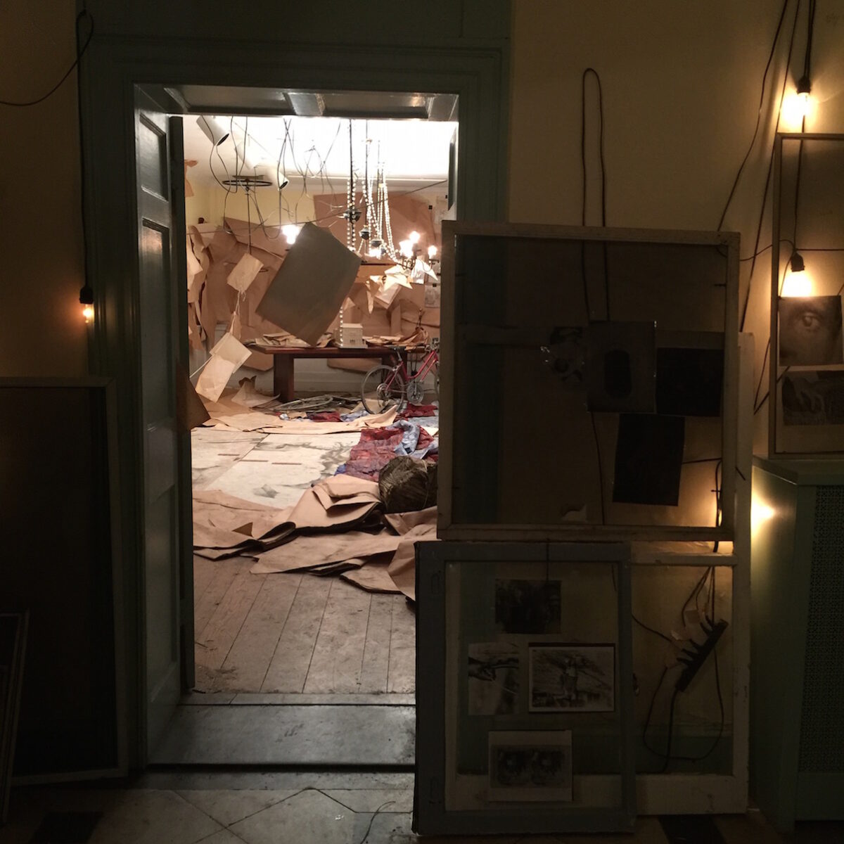 Sheets of crunchy, black something or other are piled on the ground in curving strips like wood planed from a plank. The trash bins are filled with even more stuff: glass jars of various sizes, metal things in stages of rust, something that looks like a porcelain figurine. It’s difficult to say exactly what all this stuff is or what the exact layout is because the room is illuminated only by strobe light, so our eyes only get bits and pieces of information in each flash that our brains have to piece together to form an incomplete understanding of the whole shebang. On the exhibition’s accompanying one sheet, the room is described as: “500 metal trash cans, detritus, with Black Hole Physics, A Kind of Fire, and Home Sweet Home composed by Justin Hicks featuring Kenita R. Miller-Hicks and Jade Hicks to consider the voices lost to time, space and recorded history; to the histories that speak to us that are embedded in our genome; to 500 years of ancestry living in our DNA; to use the metaphor of the bottle tree, unknown narratives, and the invisible repository of information erased by darkness.”
