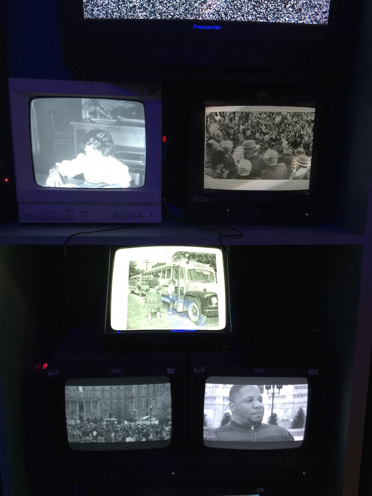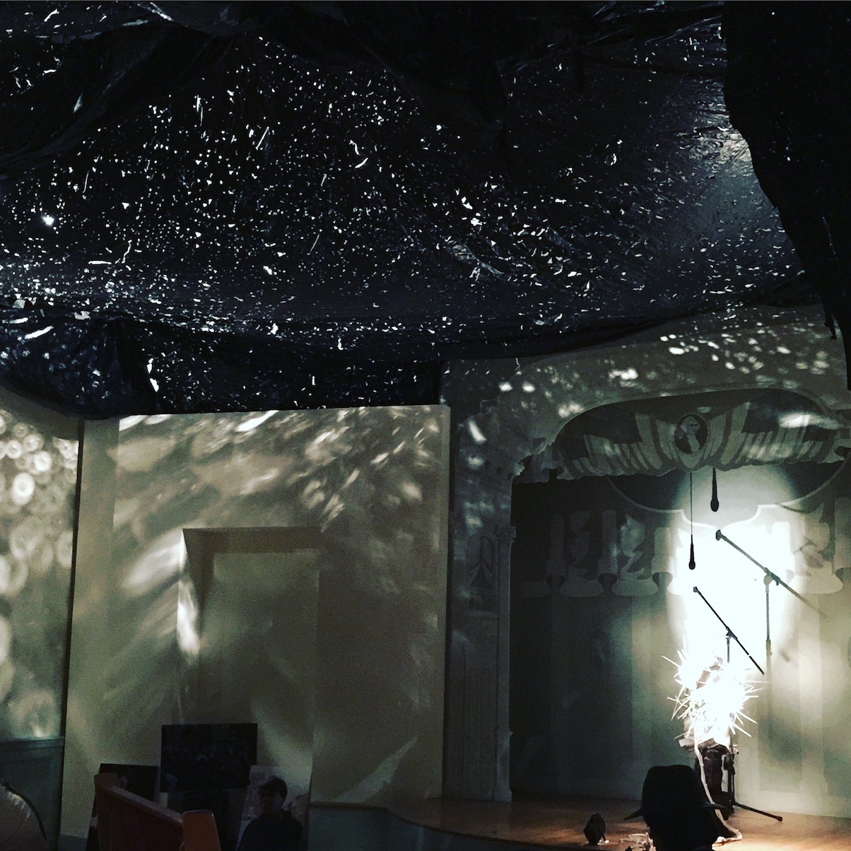 A pair of Justin Hicks’ sound pieces—”Black Hole Physics, a Kind of Fire” and “Home Sweet Home”—run on a loop and fill “The People’s Theater” and the nearby “Black Whole,” an overwhelming experience that we’ll get to in a second. One of these two sound works is a percussive thrum punctuated by chants; there’s a faint echo of demonstration march vocalizations coursing through it. The other piece sounds like an almost sacred choral work riding an haunting electronic rustle; a fragment of the “Auld Lang Syne” melody flits through it. Depending on which piece is cycling through its loop, it colors the mood to “The People’s Theater”—a crucible for spirited discussion one moment, a place for meditative reflection the next, much in the way churches function as multipurpose hubs in communities.