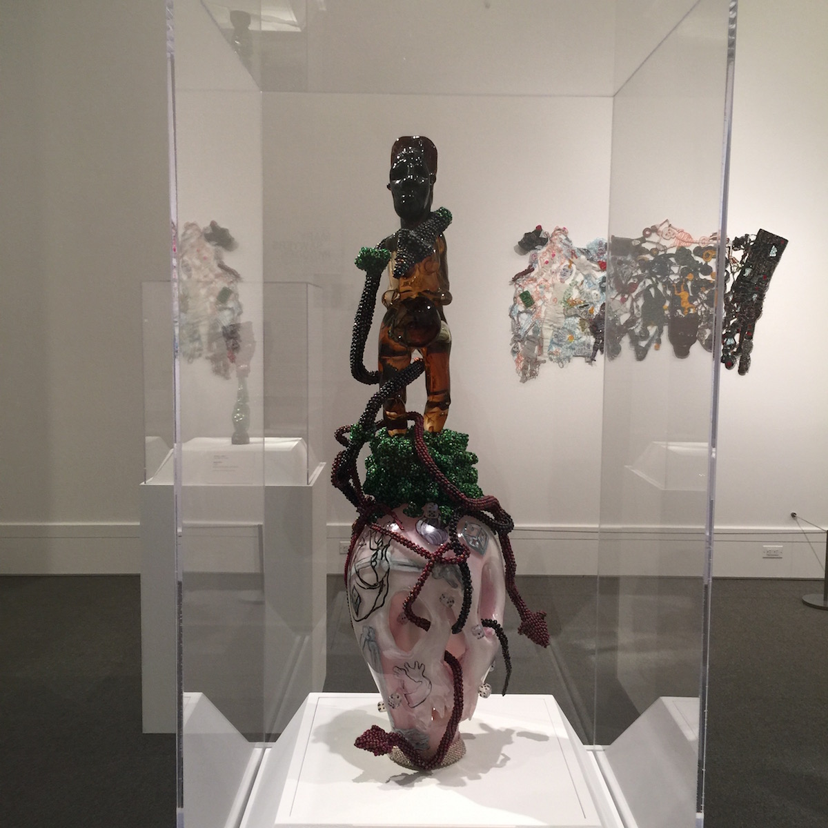Given the Baker’s enthusiasm for and commitment to the arts in Baltimore, a simple solution to the problem of this show would be to tailor a series of smaller events to the needs of each winner. While the intricate work of Joyce J. Scott, $50,000 Mary Sawyers Imboden Prize winner, delightfully fills half of the gallery space at the BMA, the rest of the show is disjointed and bare. Even so, Scott’s work in the show represents only a portion of the sculptures, jewelry, prints, and performances that make up her online portfolio. Furthermore, the museum display pacifies their content and construction with glass vitrines, raised platforms and wire lines stretched between posts, when they require the close examination these barriers inhibit.
