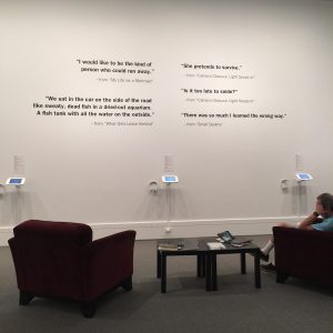 For $20,000 Mary Sawyers Baker Prize winner Jen Grow, too, a series of readings throughout the city would be better than the hollow display at the BMA that attempted to activate her ‘area’ in the gallery with large quotes on the walls and comfy reading chair. Or, a copy of her collection of short stories, My Life as a Mermaid, could be donated to every library in the state and be the book of choice for a city-wide summer book club? To read her work is to enter into vividly rendered scenes, the specificity of the sights and smells and sounds of which breathe life into the stories of longing and loss. A museum is not the proper setting for the work of a writer; if they were, bookstores would be more like them.