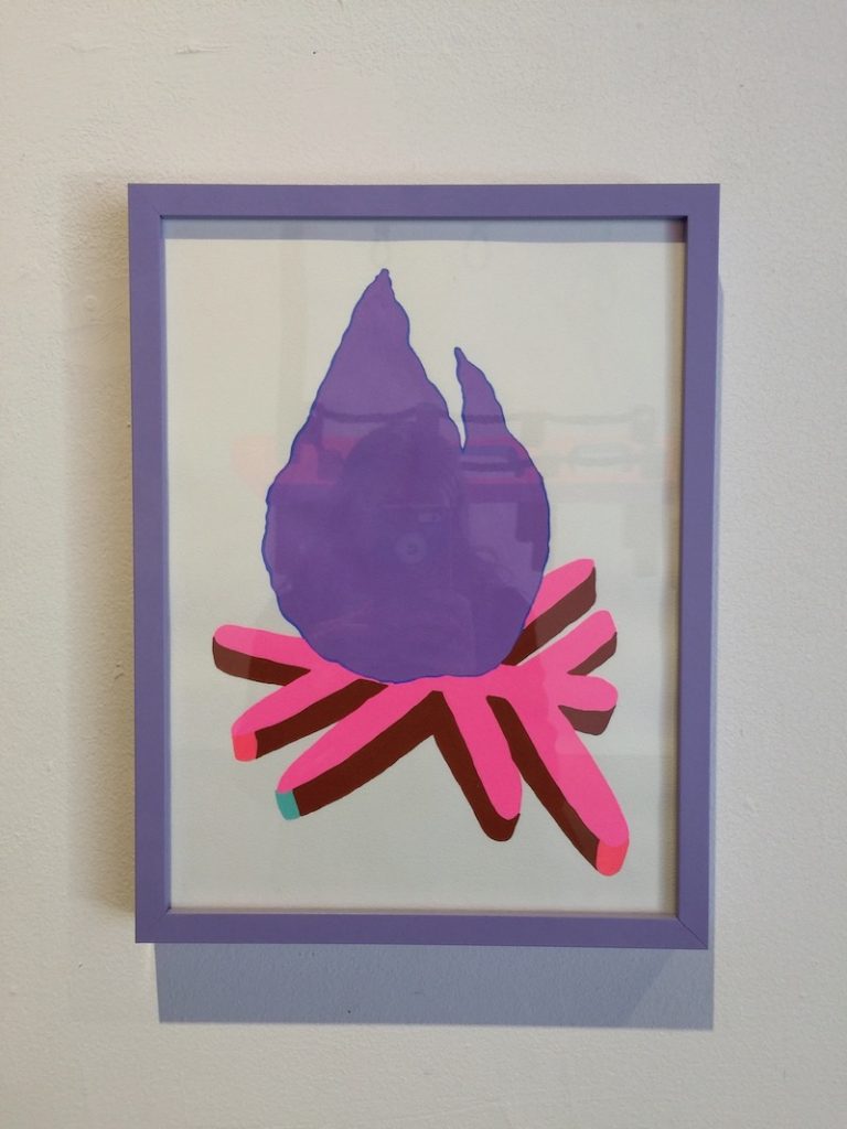 Although the show is a powerful, cohesive statement, there was one digression. A series of small paintings in purple frames fills one wall with works which seem like details from the larger narrative or studies for it. They’re small and sellable and consistent in Reed’s 1980’s palette of hot pink, purple, and teal. Rendered in a charming illustrative style, in their separation and smallness these works feel irrelevant to the rest of the show. They would be great for quirky greeting cards or T-shirts, or combined into a gif or video, but here, in contrast with the powerfully large murals and video, they are reduced to being merely cute and undermine the seriousness of their message.
