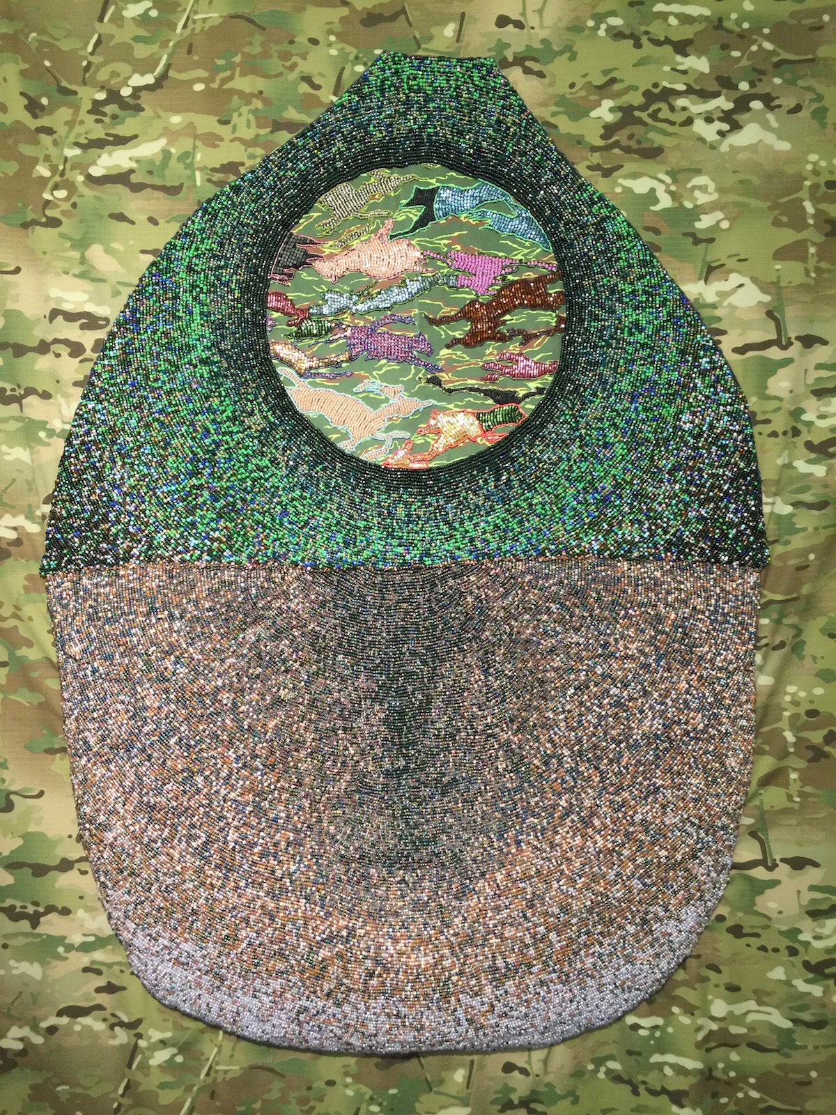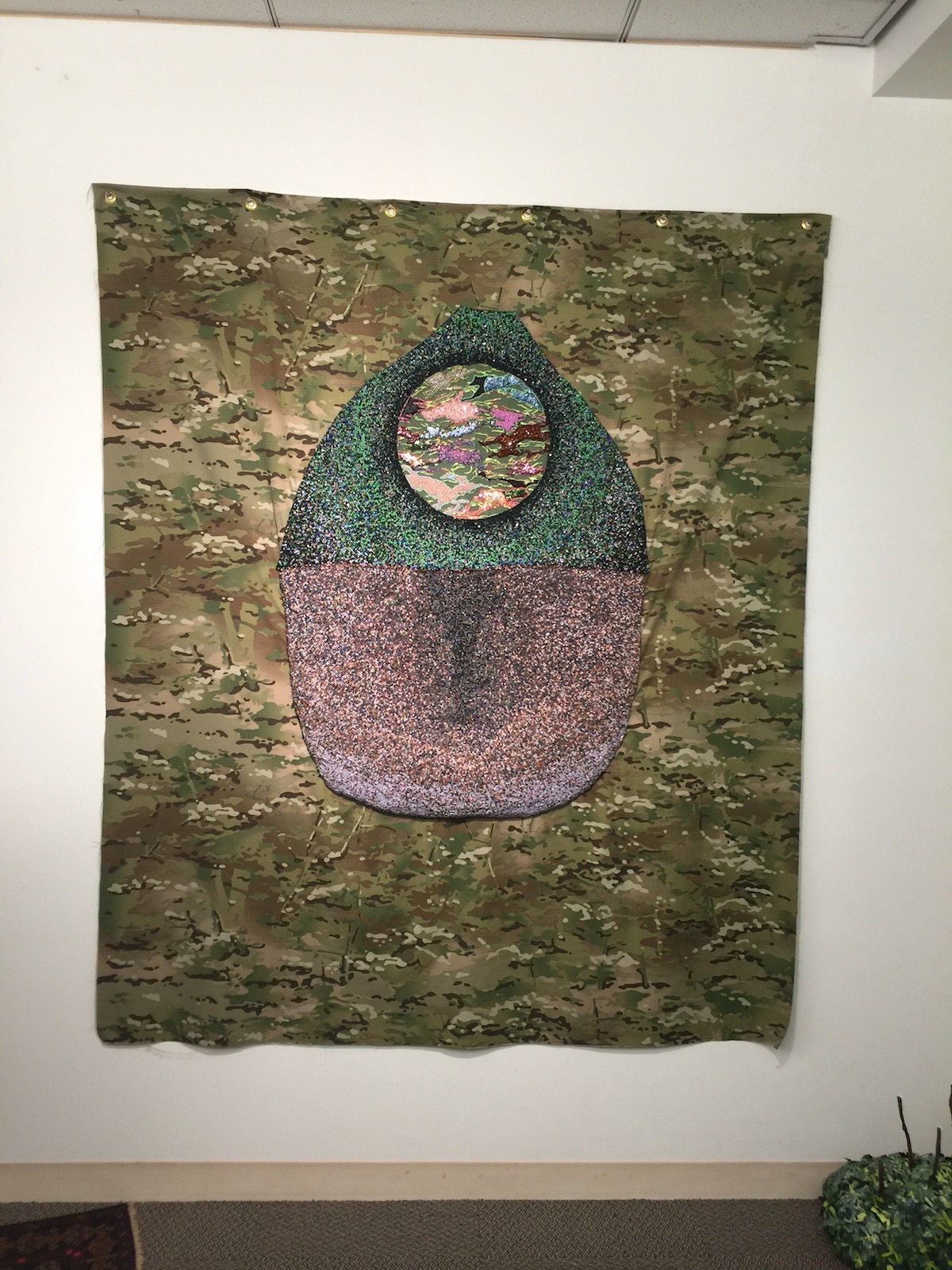 Simon Mullan is another artist working with non-traditional materials. Berlin-based Dittrich and Schlechtreim showed pieces from Mullan’s work with tile and grout as well as pieces from his series of bomber jacket works. Mullan deconstructs the vintage silk jackets and sews them into abstract compositions.