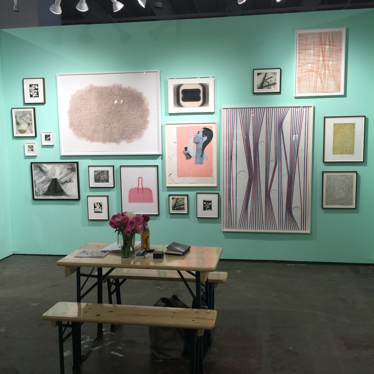 Wallpaper, painted wall treatments, alternative flooring, lighting and the inclusion of softening features such as plants and artist-made chairs have become de rigueur. Almost completely absent were any whispers of flash in the form of neon, glitter or in-your-face entail. Instead, pleasing geometric abstractions employed color, tabletop sized non-functional ceramic pieces provided humor and the occasional collage piece suggested some connection to history or the entertainment industry.