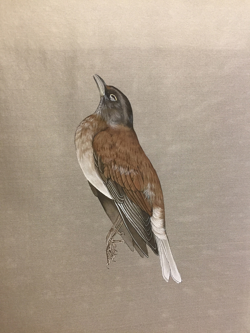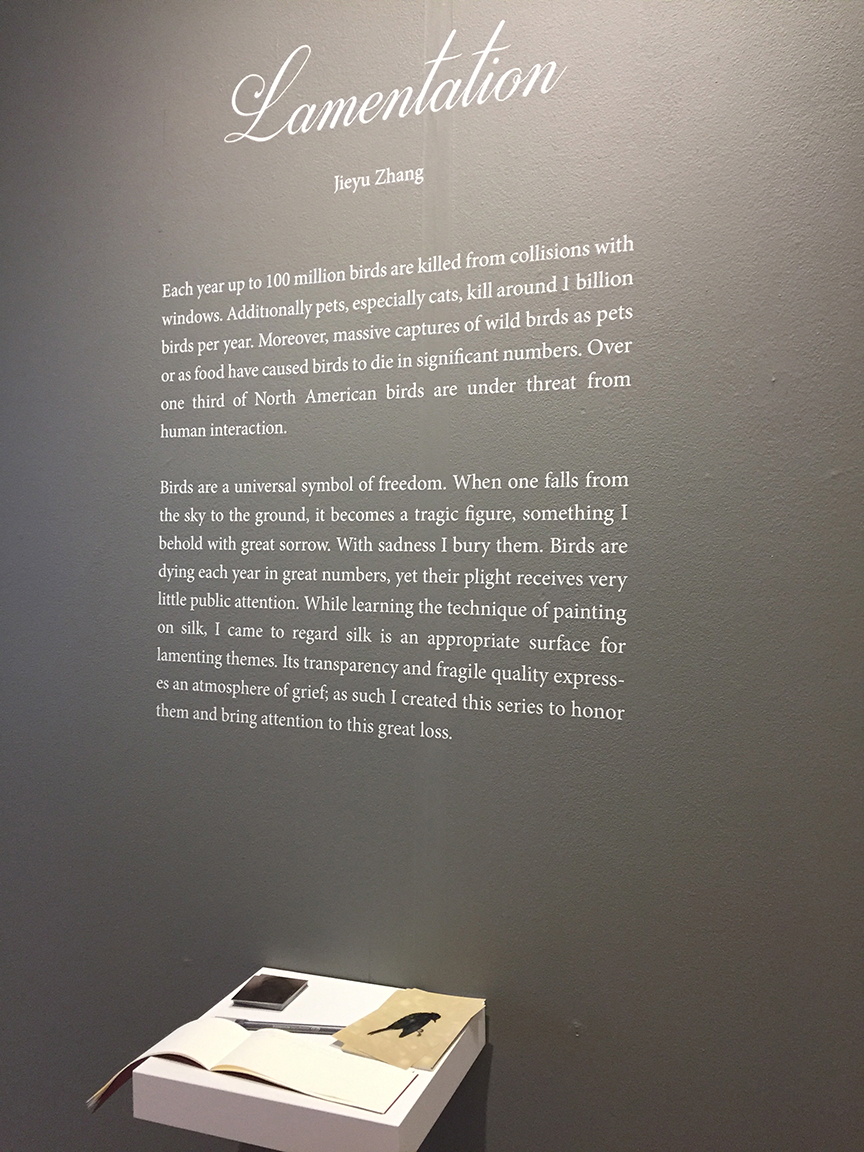 Beautiful and delicate painted birds on silk by Jieyu Zhang. She created this work, Lamentation, to memorialize the over 100 million birds that collide with windows annually and bring awareness to the harm done by human interaction with birds.