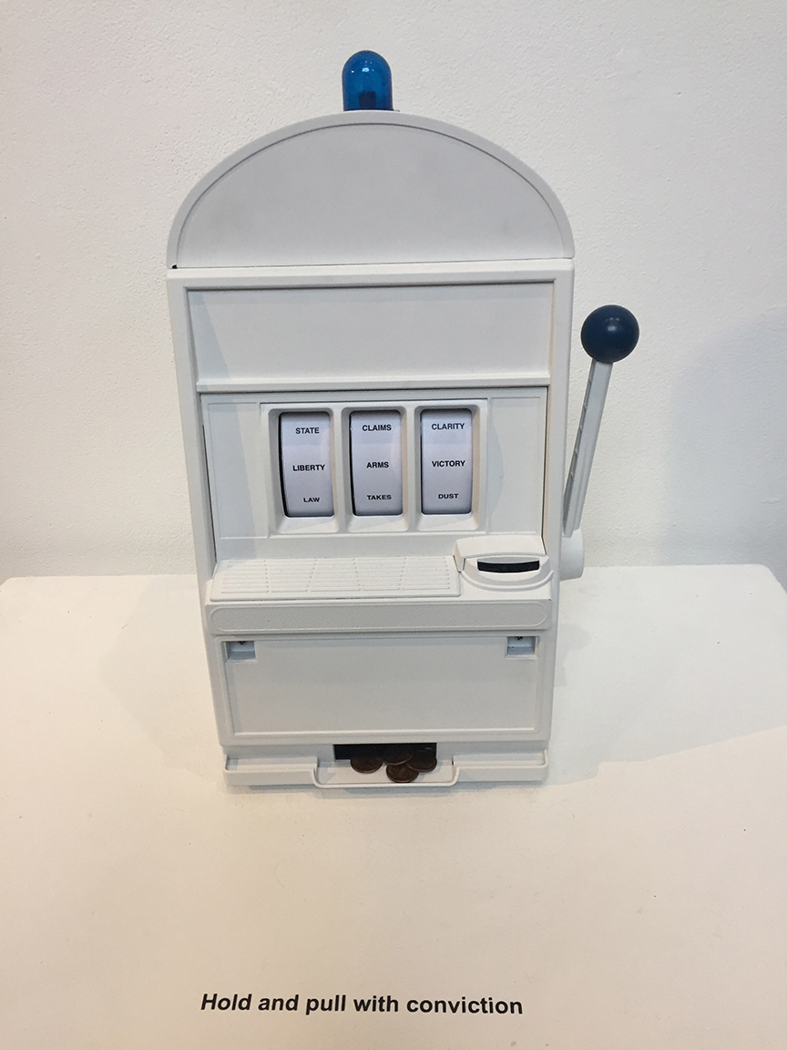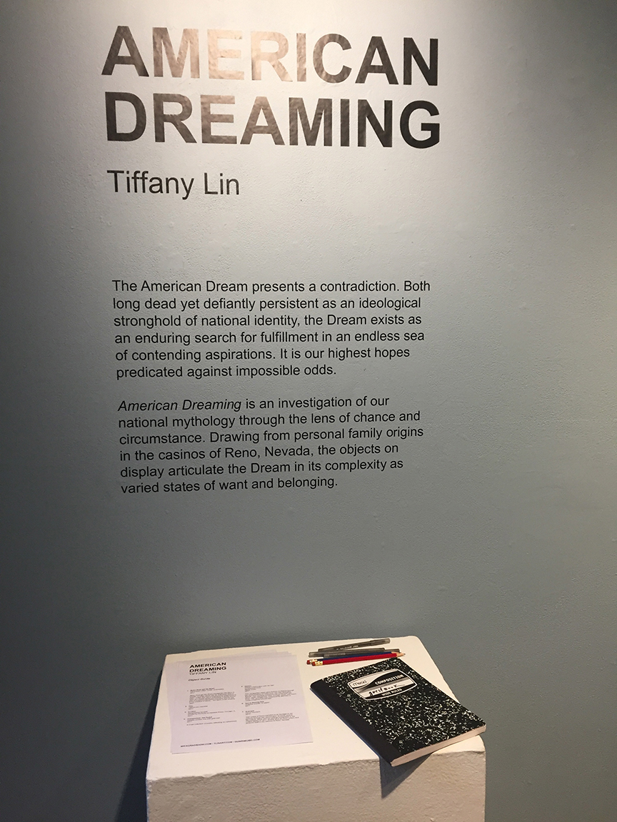 American Dream by Tiffany Lin. Lin is a Taiwanese-American whose family history is entangled with U.S. Casinos and the idea of chance. Lin hacked a slot machine to create idyllic word machinations like “Truth Take Clarity” the machine also plays “Ring of Fire” by Johnny Cash after every handle-pull. American Dream includes a small book of prints by Lin, found school tables a board of chance game, and a custom flag- all speaking to the mythology and subjectivity of American life.