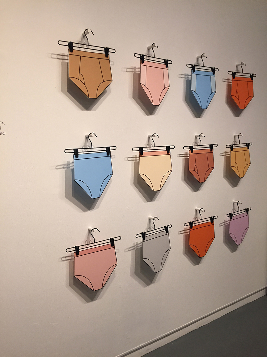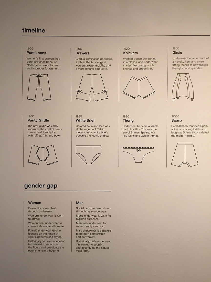 The graphic argues that women’s underwear has become a marker of femininity while men’s underwear often focus on function. Another example of women being expected to do the same as men while dealing with discomfort in process or women wearing garments that present the female form to men in a way that pleases their societal notions of the ideal silhouette.