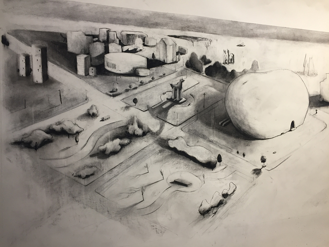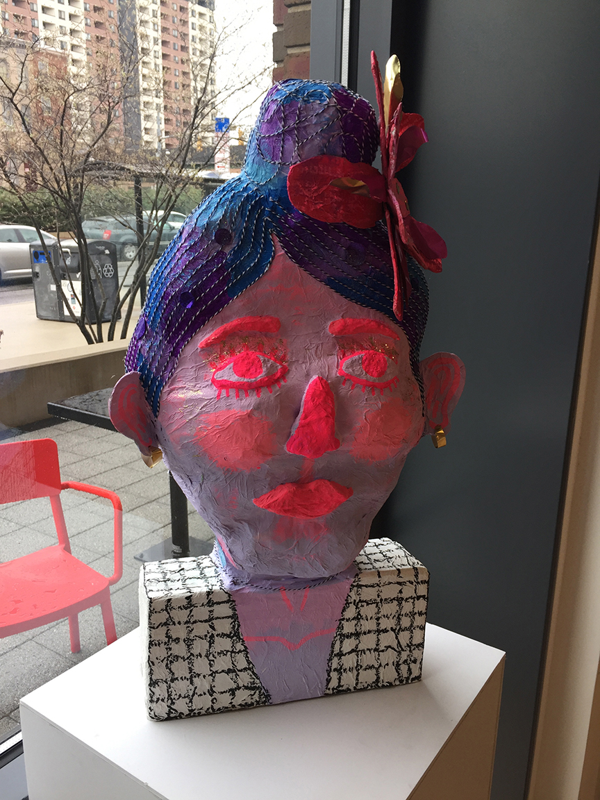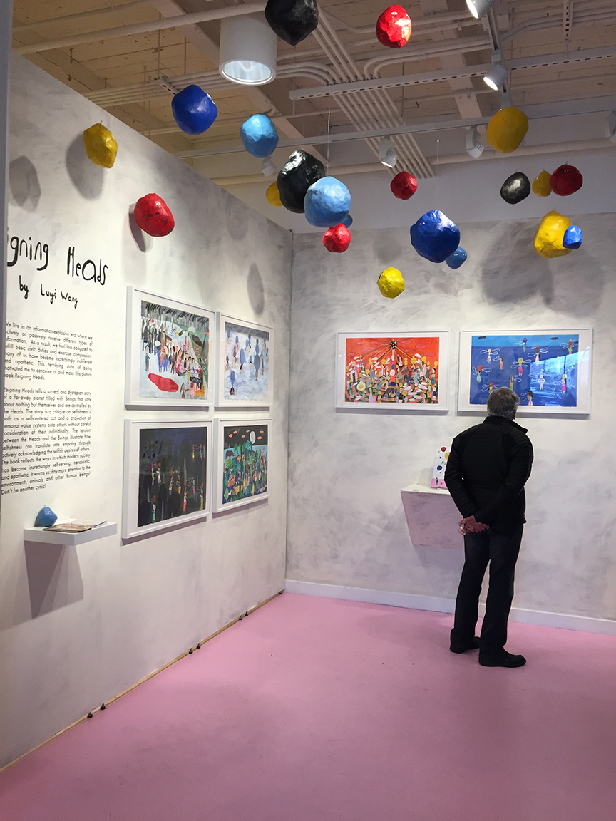 Reigning Heads thesis by Luyi Wang, presents a futuristic hand-painted world that depicts a civilization controlled by “The Heads”. Wang’s section of the exhibition is guarded by Omni-present floating paper Mache heads. “Reigning Heads” the book includes illustrations by Wang that reflects the ways in which modern society has become increasingly self-serving, narcissistic, and apathetic.