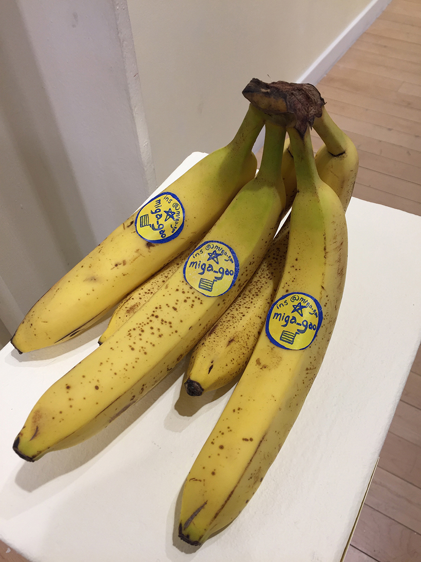 Jia Gao’s thesis Spotted Banana revolves around creating a world where apes mimic a social structure strikingly close to those in human structures. The apes live in social castes where golden bananas act as unfairly distributed currency. Gao’s story unfolds through a book, works on paper, custom-stickered bananas, and a coded sheet for the language she created for this body of work.