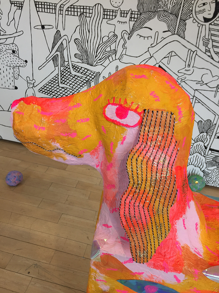 Aditi Damle’s Say Hello to My Brain is a wonderfully bizarre combination of paper mache people, animals, and plants presented in front of a hand-painted wall mural. Damle also shares porcelain characters that mimic those depicted in the sculptures and paintings. Damle heightens aspects of daily life to become comical and visually pleasing vignettes. Damle is also a 2017 recipient of MICA’s Graduate Research Development Grant.