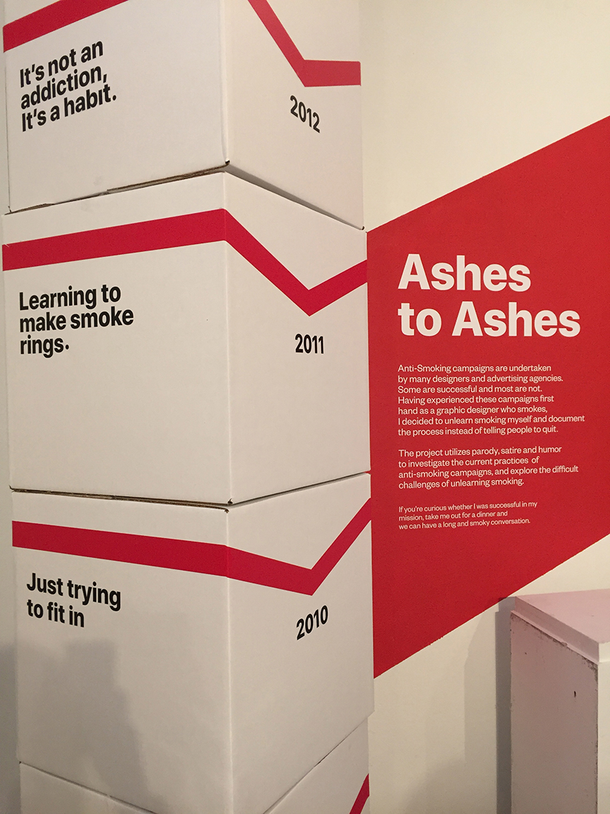 AMPT! The campaign by Gurleen Saini highlights a collection of professional football players that are also amputees. Three players are featured with trading cards that hold their names, ages, stats, and where they play. Saini’s tagline on the striped wall at the entrance of the show reads, “Think you need two legs? Think again.” Saini’s thesis highlights an unexpected but important need for design in areas beyond those most glamorous. This work encourages the belief that good design should live in all places.