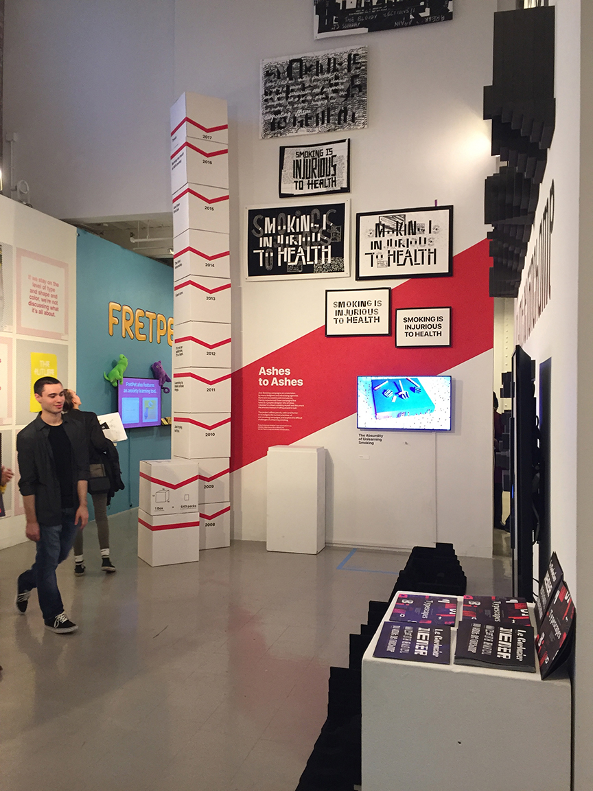 Typescapes by Daniel Frumhoff are located at the beginning of the Graphic Design exhibition. Frumhoff offers expolorations in type in physical and digital mediums. On the floor is a large sculptural piece that reads like a topographic landscape, and in context, type. Frumhoff expresses interest in architectural landscapes, elevations, plans and applies this to his approach to typography.